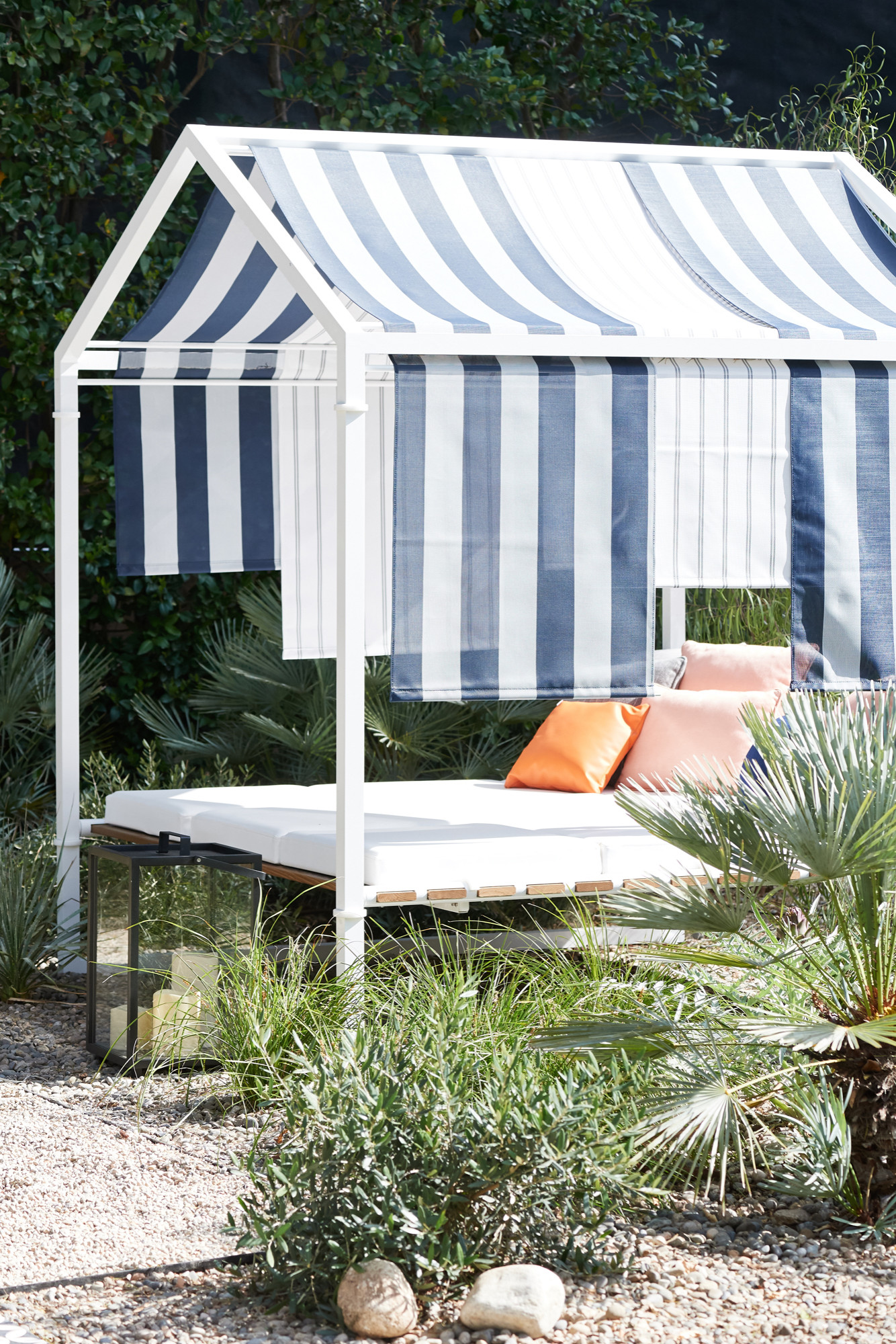 Greenberg also recommends adding a bright color in the form of a bench or other small structure. “A strategically placed unique element, maybe painted in a bright blue or red lacquer, will add a touch of whimsy,” she says. “The pop of color is typically unexpected and will connect the colors of the interiors to the outdoors.”