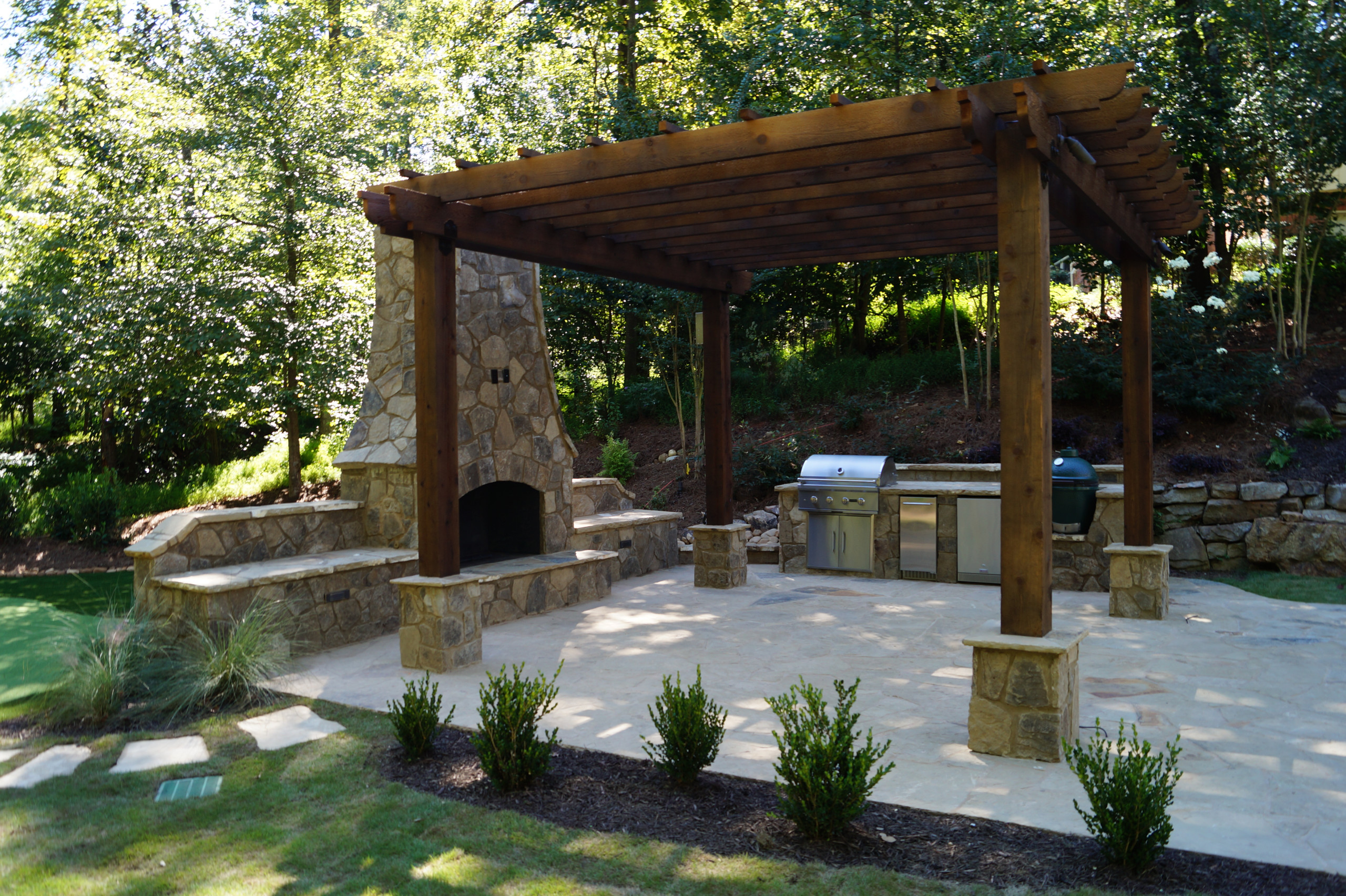 An outdoor fireplace is the most-requested item at Arnold Masonry & Landscape in Atlanta. “People are obviously attracted to a fireplace,” says owner Scott Arnold. Many are looking to bring family and friends together or have a romantic, peaceful evening enjoying the wonderful outdoors. Arnold adds that the chimney is often the focal point of the fireplace and should be created with that in mind.