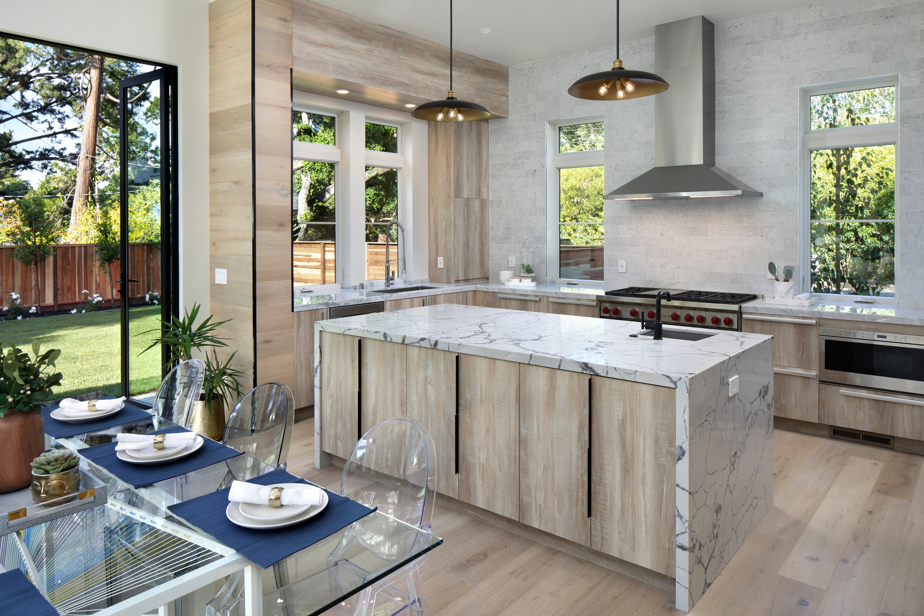 Other special features. Stone slab backsplash of Arabescato Orobico, a dark Italian marble. “The stone has veining that picks up the warmth of the wood cabinets, while the Black Opalescence granite countertops add just the right amount of contrast,” Castle says. The large custom range hood features a patina steel finish.