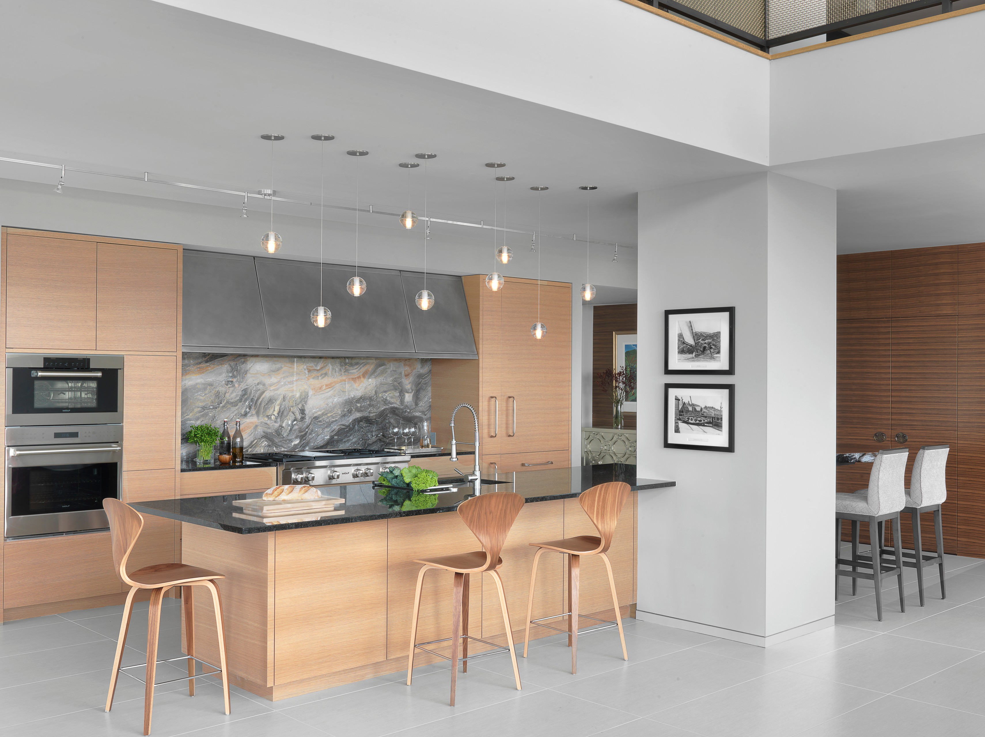 Designer tip. Castle looked for opportunities to incorporate elements into the design that softened the sharp lines of the interior architecture. In the kitchen, she used a cluster of nine small pendants with 4-inch blown glass globes strung over the length of the island. “Since they are individually mounted, I arranged them in a playful nonlinear pattern and hung them at varying heights,” Castle says. “The effect is almost a sculpture-like element that is playful yet striking.”
