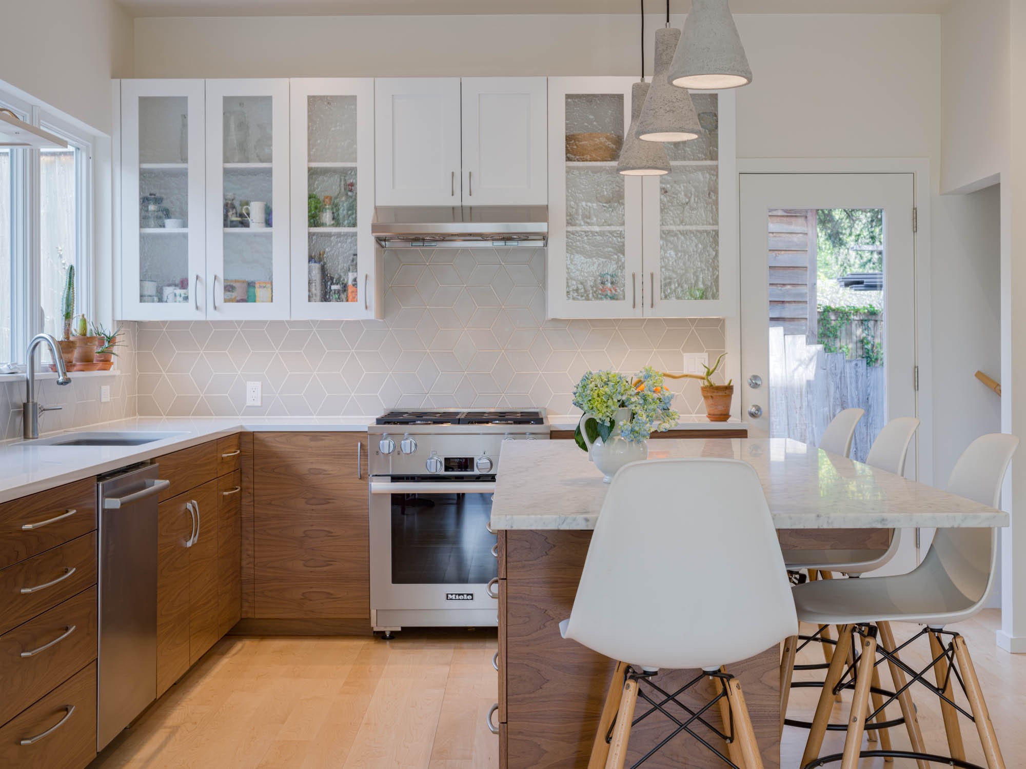 “Uh-oh” moment. “The frosted window on the right side of the image looks onto a neighbor’s home and was previously a more traditional bay window,” Ely says. “We based the kitchen design around altering the bay window, but for a moment it seemed like the permit examiner wasn’t going to allow this modification since the home is too close to a property line. However, since it was overall a decrease in the amount of window, we were able to argue that it was improving the existing conditions, and were allowed to replace the bay window with a more contemporary rectangular window, frosted to allow light in but obscure the view of the side of the neighbor’s house.”