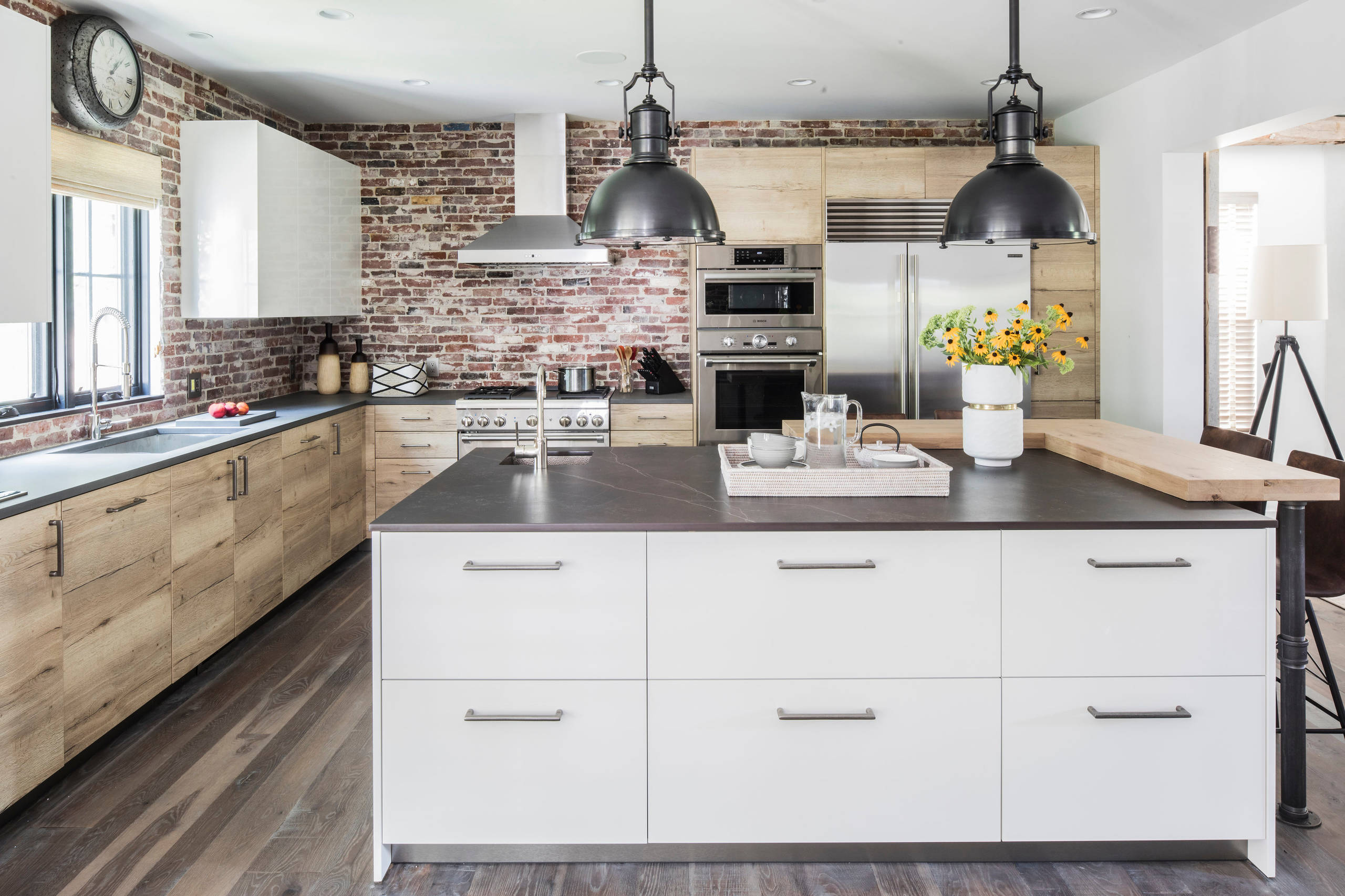 Other special features. Antique reclaimed-brick backsplash, hand-distressed white oak floors with a custom stain, a 3-inch-thick oak countertop on metal pipe legs on a corner of the island. The perimeter countertops are Pacific Grey quartzite. The island countertop is Dekton, which is a blend of quartz, porcelain and glass.