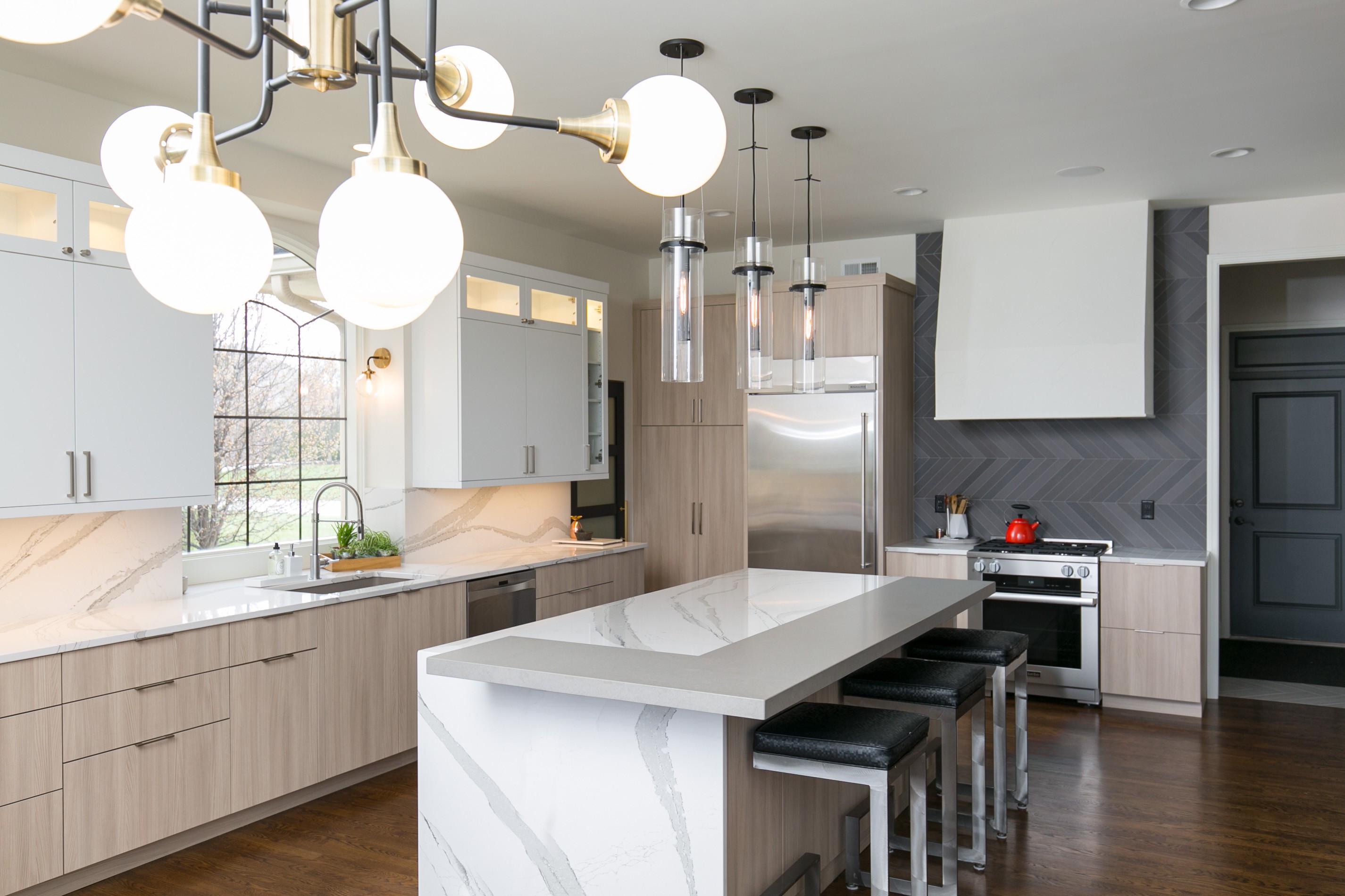 Other special features. Quartz with a marble look for the island and perimeter countertops and sink wall backsplash. A second-tier countertop on the island is gray quartz, and the range backsplash is lead-colored porcelain tile in a vertical chevron pattern.