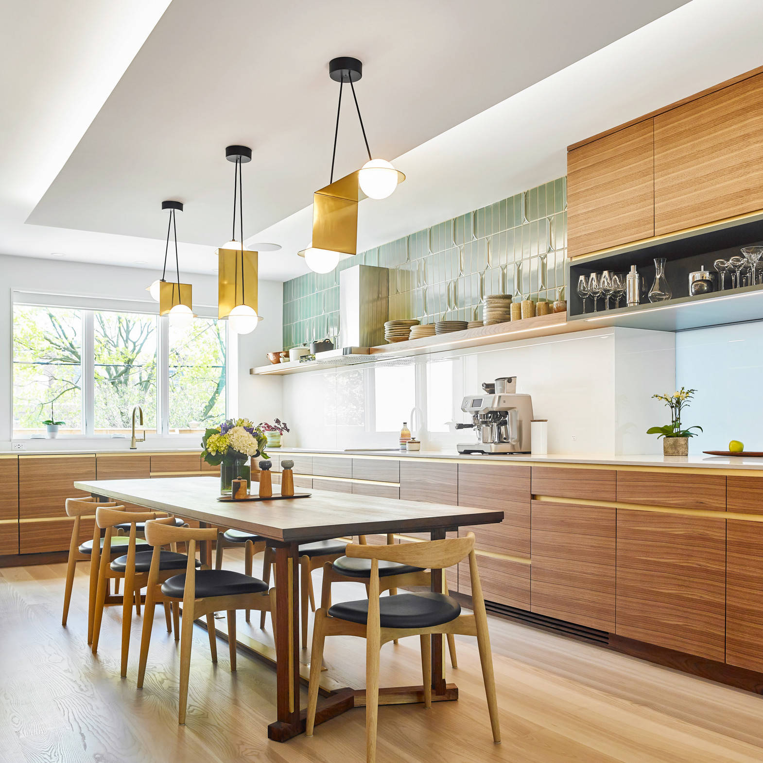 Other special features. A custom walnut harvest table that can seat 10 to 12 people and double as an island for additional prep space. The backsplash is glass that’s back-painted white. Light green handmade ceramic tiles above the floating shelf complement the warm wood tones and brass. “Then the random placement of sculptural tiles within the field creates some visual interest and backdrop for the client’s collection of ceramics and tableware,” Ely says.