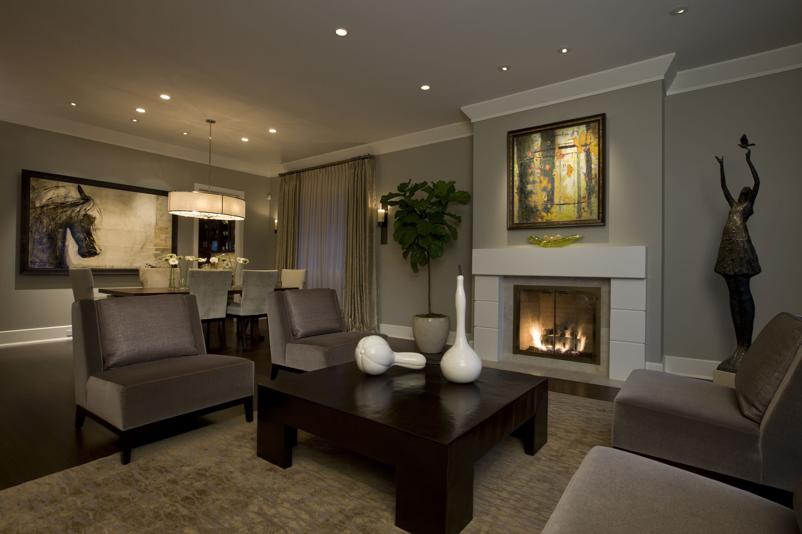 In this smart-looking contemporary great room, for example, phase one could have been the two sofas and the coffee table, and phase two could have been the cowhide chairs and end tables.