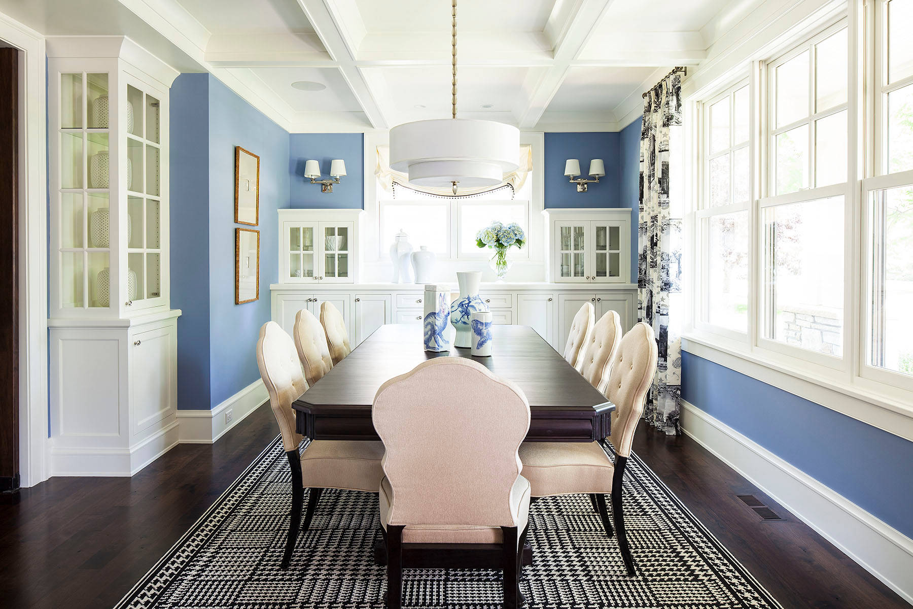 This could be a favorite picture or painting, a chair with a fabric you love, a piece of clothing, a set of dishes or — as in the case of this dining room, perhaps — a collection of blue and white vases. The vases could easily have been the inspiration that determined the direction of this entire blue and white dining room.