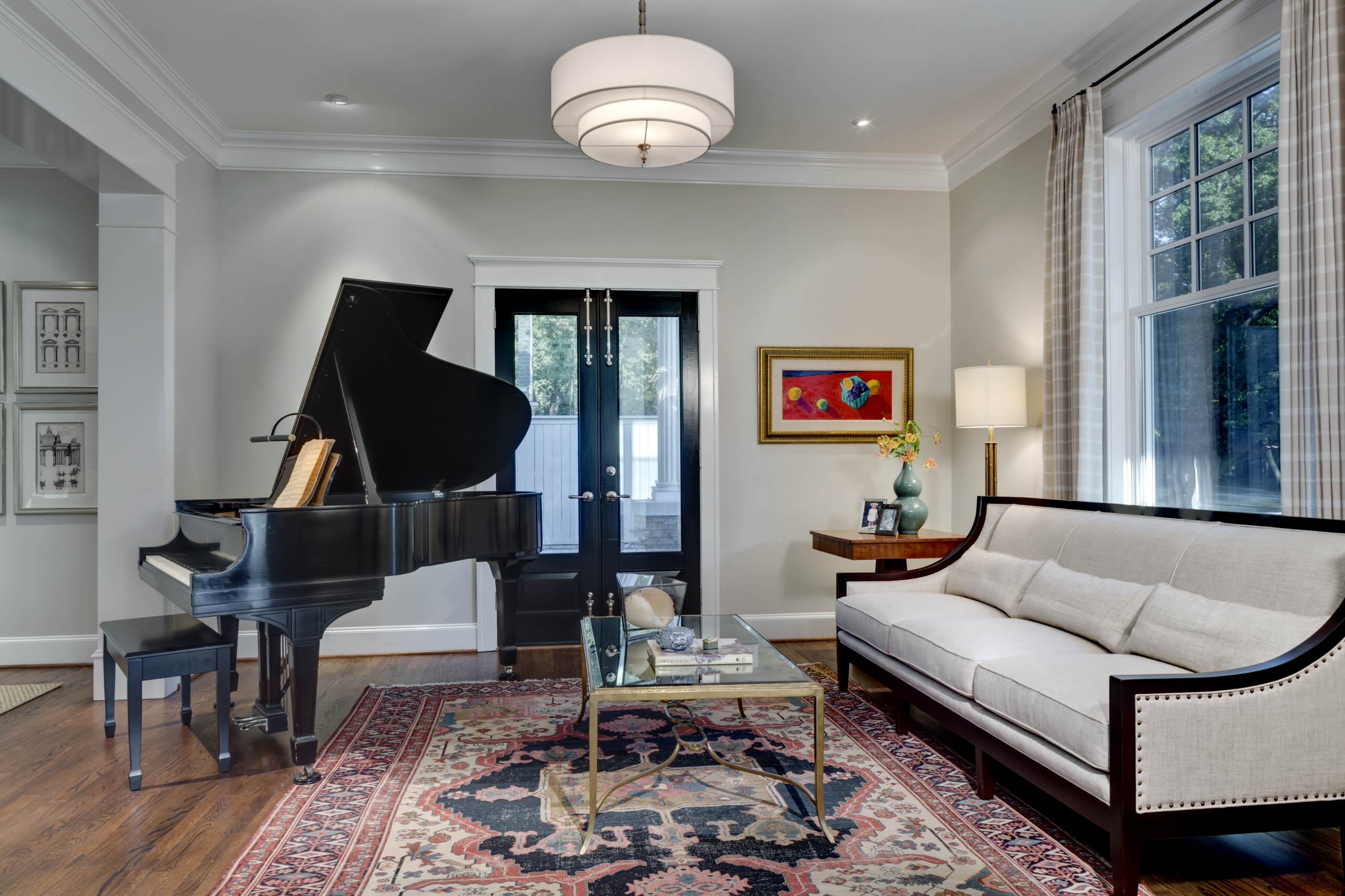 In this very attractive living room, for instance, the owner might have said he loves the grand piano. Fantastic! It’s a focal point and a great place to start. You can see how the rest of the room takes its cue from that one piece, in details such as the black doors and the trim on the sofa.