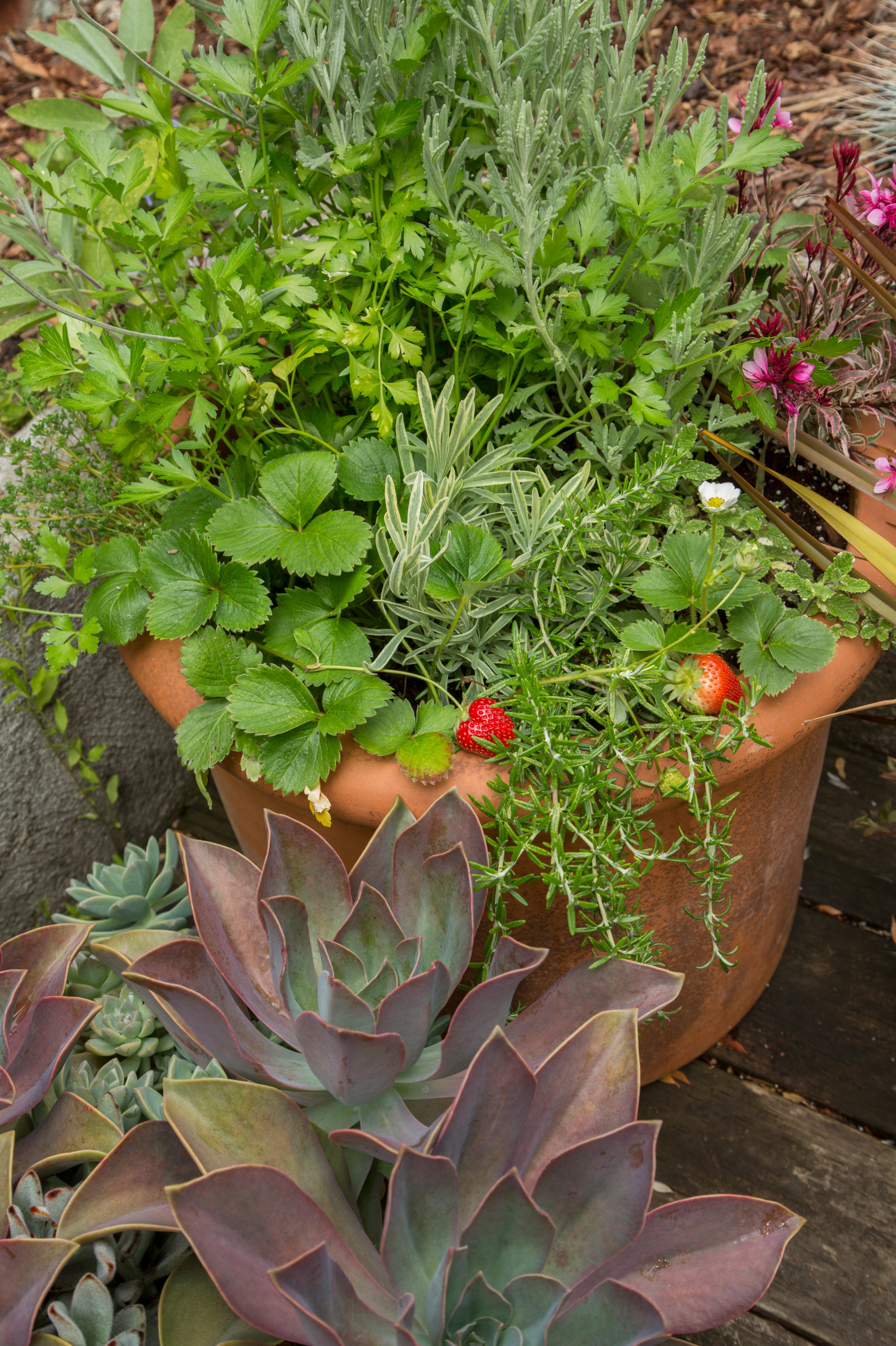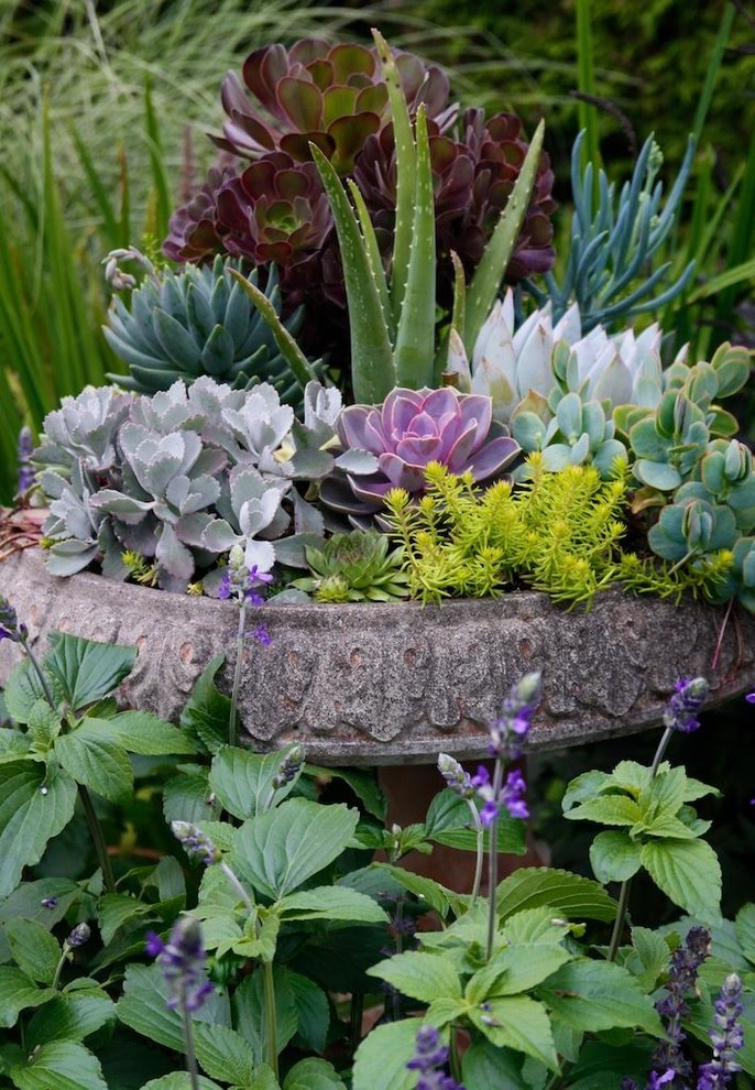 7. Pastel hues. Potted arrangements of fuss-free succulents look good now and will continue to grow all summer long with little additional care. Select a combination with a variety of colors, forms and textures, from rosette-forming echeverias to upright aeoniums and fine-textured ground cover sedums. In this container combination, a vivid purple echeveria (Echeveria ‘Perle Von Nürnberg’) is a particular standout.