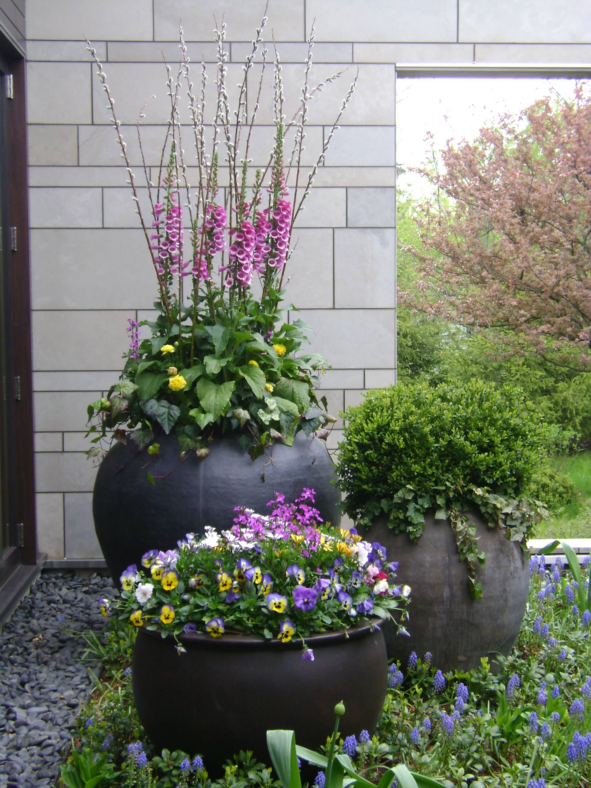 2. Spring trio. Make an impact with an odd number of spring containers arranged together in a vignette. The designer of this entryway trio massed colorful pansies and nemesias in the lowest container, planted the medium container with an evergreen combination of boxwood and trailing ivy, and played up the height of the largest container with purple foxgloves (Digitalus sp.).