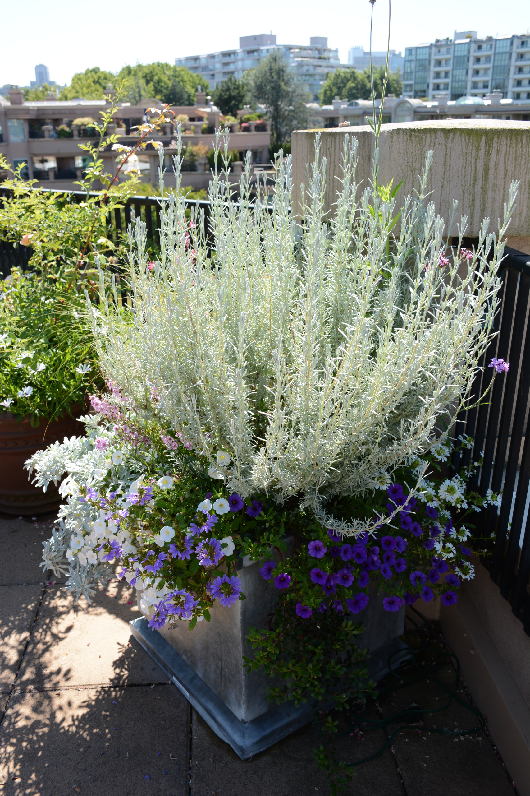 11. Icy blues. Plant this beauty now and enjoy blooms all summer. Silver-leaved lavender, such as Lavandula stoechas ‘Silver Anouk’, looks fresh for spring and grows into a pale, shimmering shrub with medium-purple flowers through spring and summer. Surround a potted lavender with warm-season annuals such as calibrachoa or perennial silver-leaved spiller Silver Cascade dusty miller (Artemisia stelleriana).
