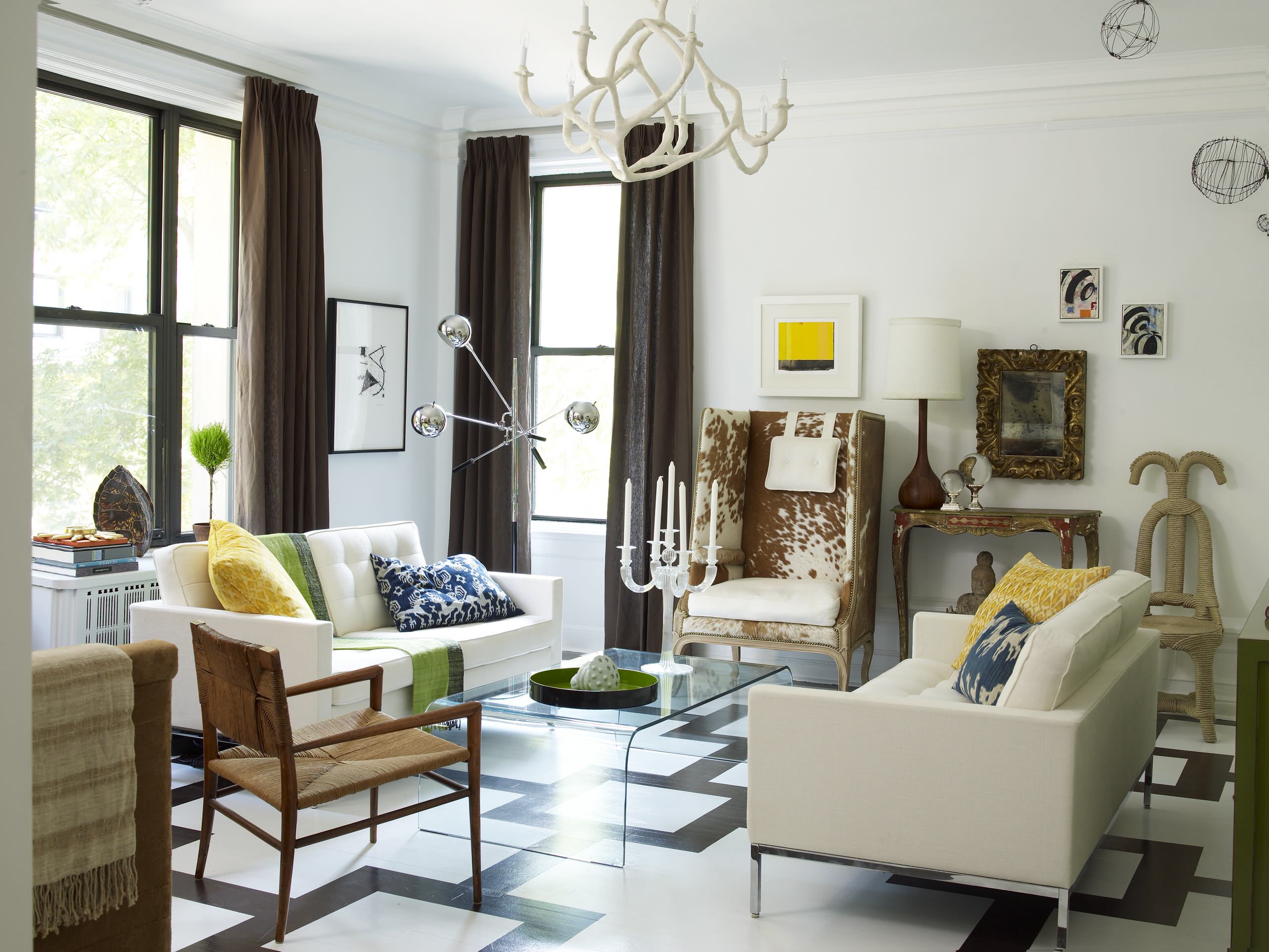 11. Use asymmetrical rugs in oddly shaped rooms. When in doubt, a faux-cowhide rug or another asymmetrical rug is a great fit for an unusually shaped space, as the organic form plays well tucked in odd corners or floating in the center of a larger space, even layered over a larger carpet.