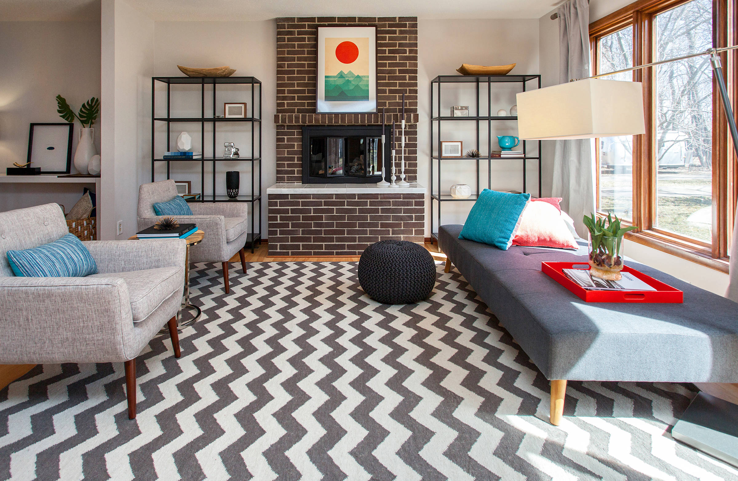 12. Make rugs your “accent wall.” Besides defining an area, rugs are also a great way to bring a sense of color to a zone in a house when there are no walls to logically pick as an accent. This a good approach for homes with unusual or open floor plans in which the rooms don’t have clear starting and ending points. Drop them anywhere to add a sense of structure without touching the walls.