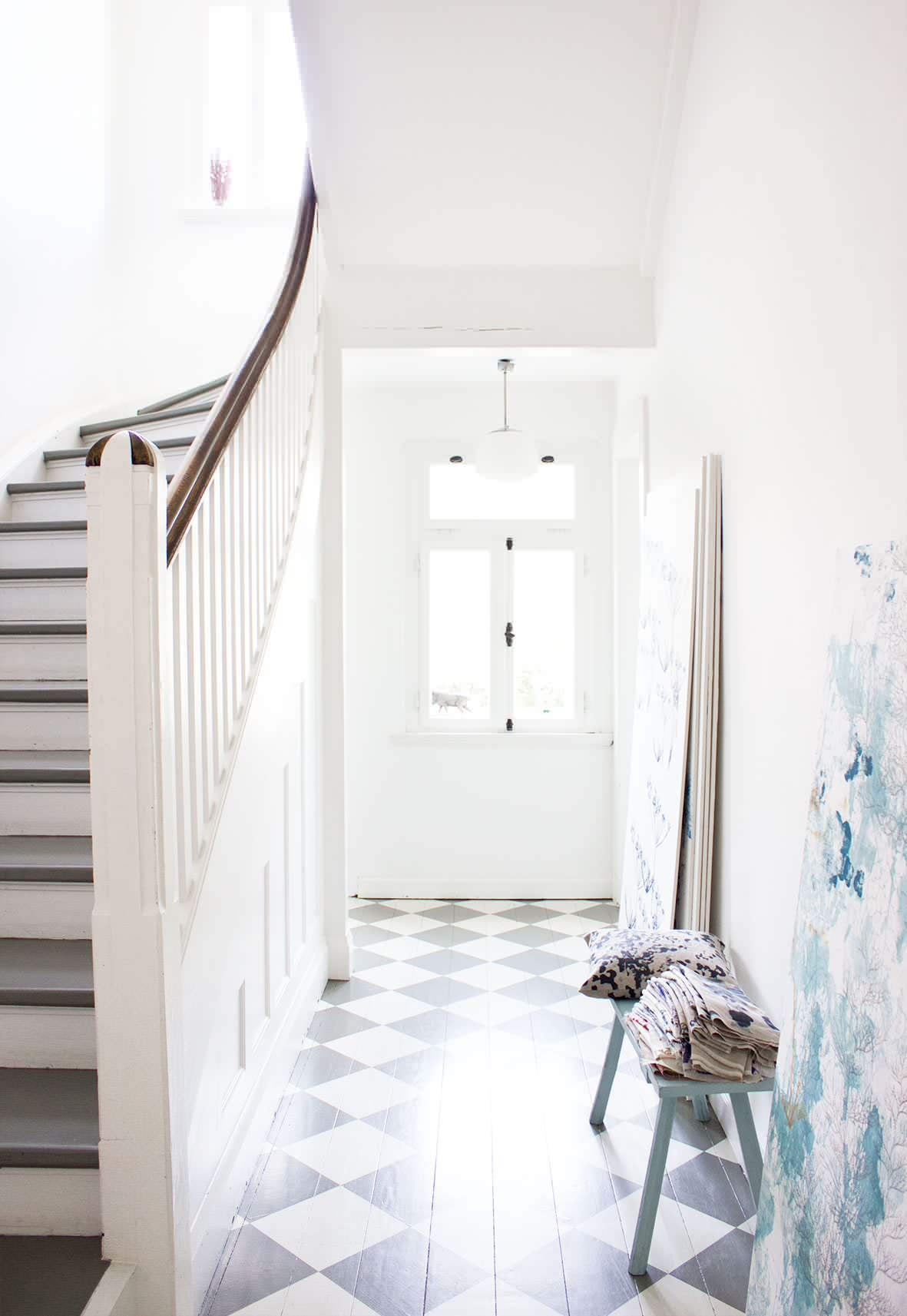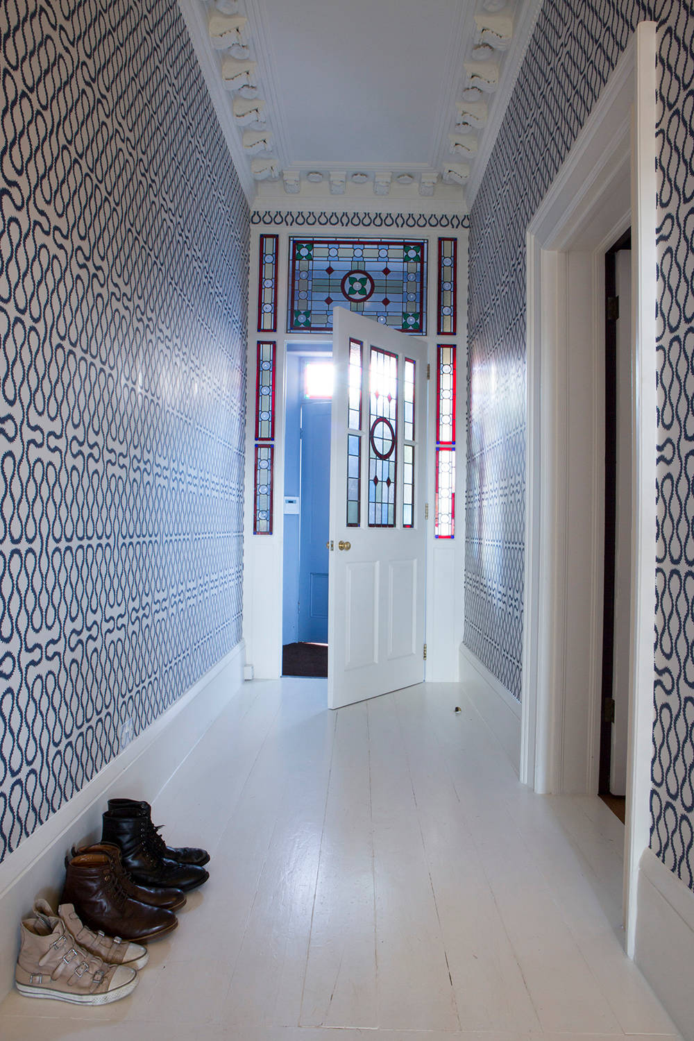 This is not to say that white walls are the only option. Pairing intricate windows with more pattern can also create a rich, stunning effect. Look for patterns that pick up on an aspect of the window or of a trim detail, like how this looping-print wallpaper echoes the circles and geometric lines of the window (and continues the blue tones).