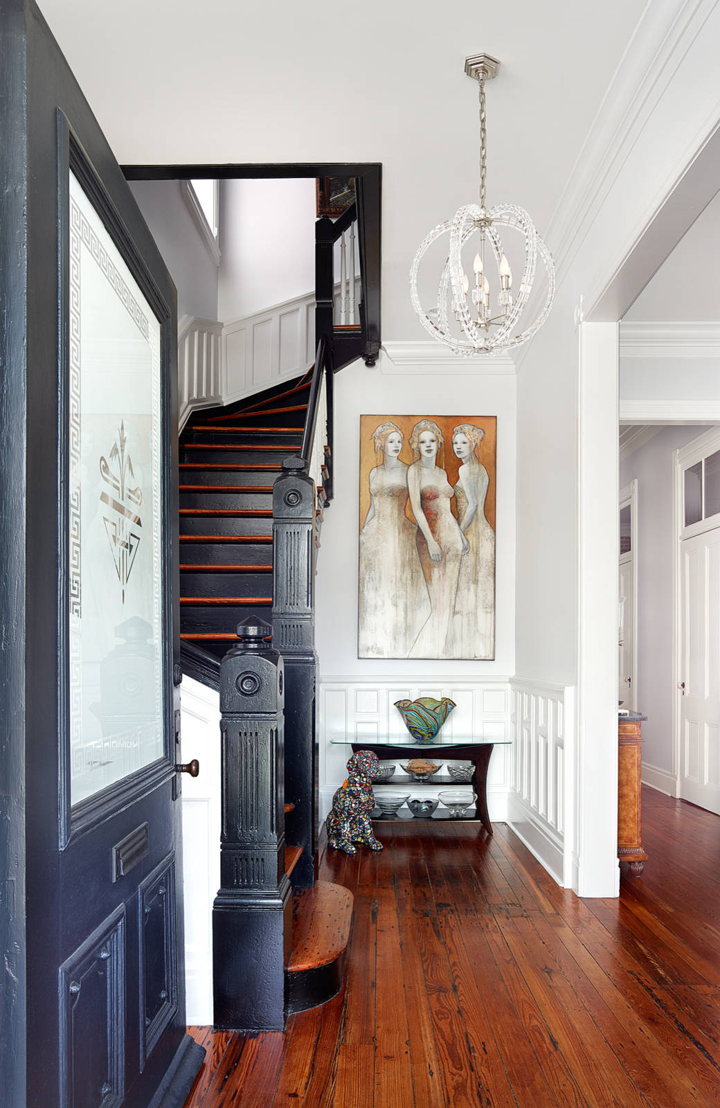 In this redesigned Toronto house, not only did we feature the beautiful window trim with satin paint and sleek shades, but we preserved other unique details, like the unusual pass-through between the front room and the entry (to the left). Rather than filling or tearing open the large window, we filled it with a faux-iron decorative grate to keep the space functionally divided while maintaining and even adding to the visual charm.