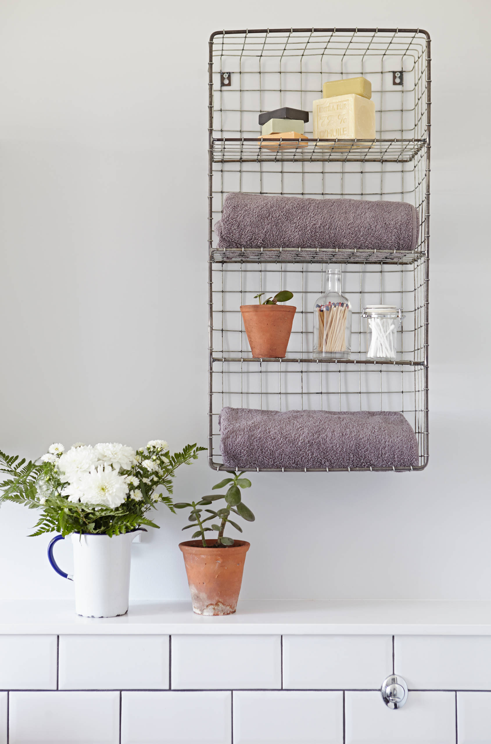 A wire shelf unit makes a great addition to a bathroom. It adds both storage and display space, brightens up a dull wall and is lightweight and easy to hang.