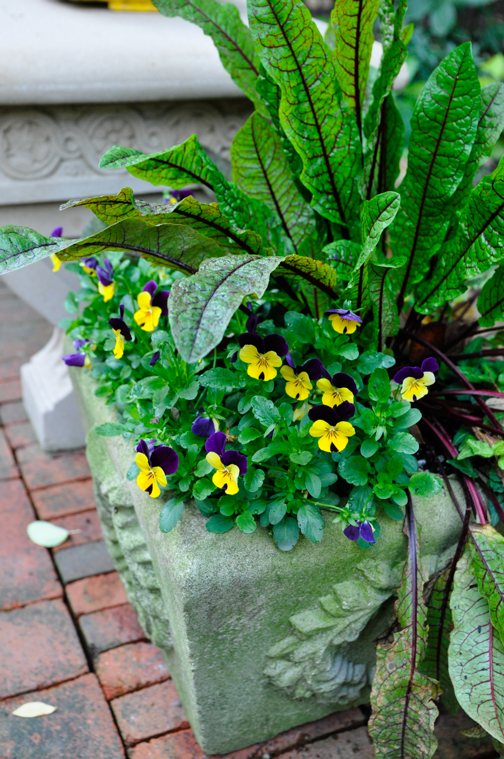 13. Edible. You might not know it at first glance, but both spring plants used in this container are edible. The red-veined leaves of sorrel (Rumex acetosa) have a lemony flavor and can be used in soups or mixed with other greens in salads. The viola flowers are also edible and make a pretty salad garnish. The two plants’ dramatic color combination makes for an eye-catching winter or spring container.