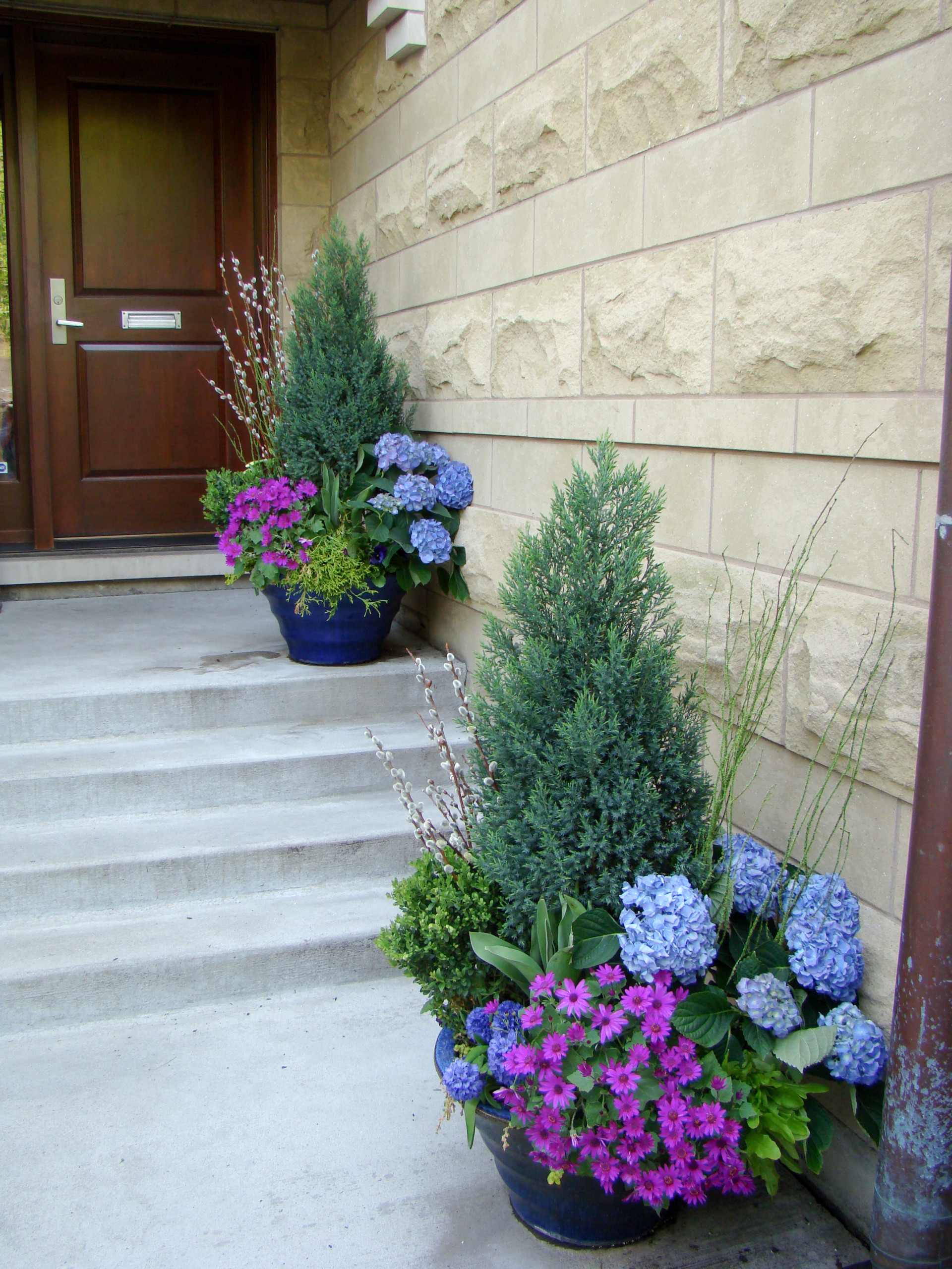 9. Mixed with conifers. The designer of these entryway containers put together a combination of tulips (only foliage remains here), blue bedding hydrangeas and purple annuals, centered around two evergreen junipers, to create a soothing spring display.