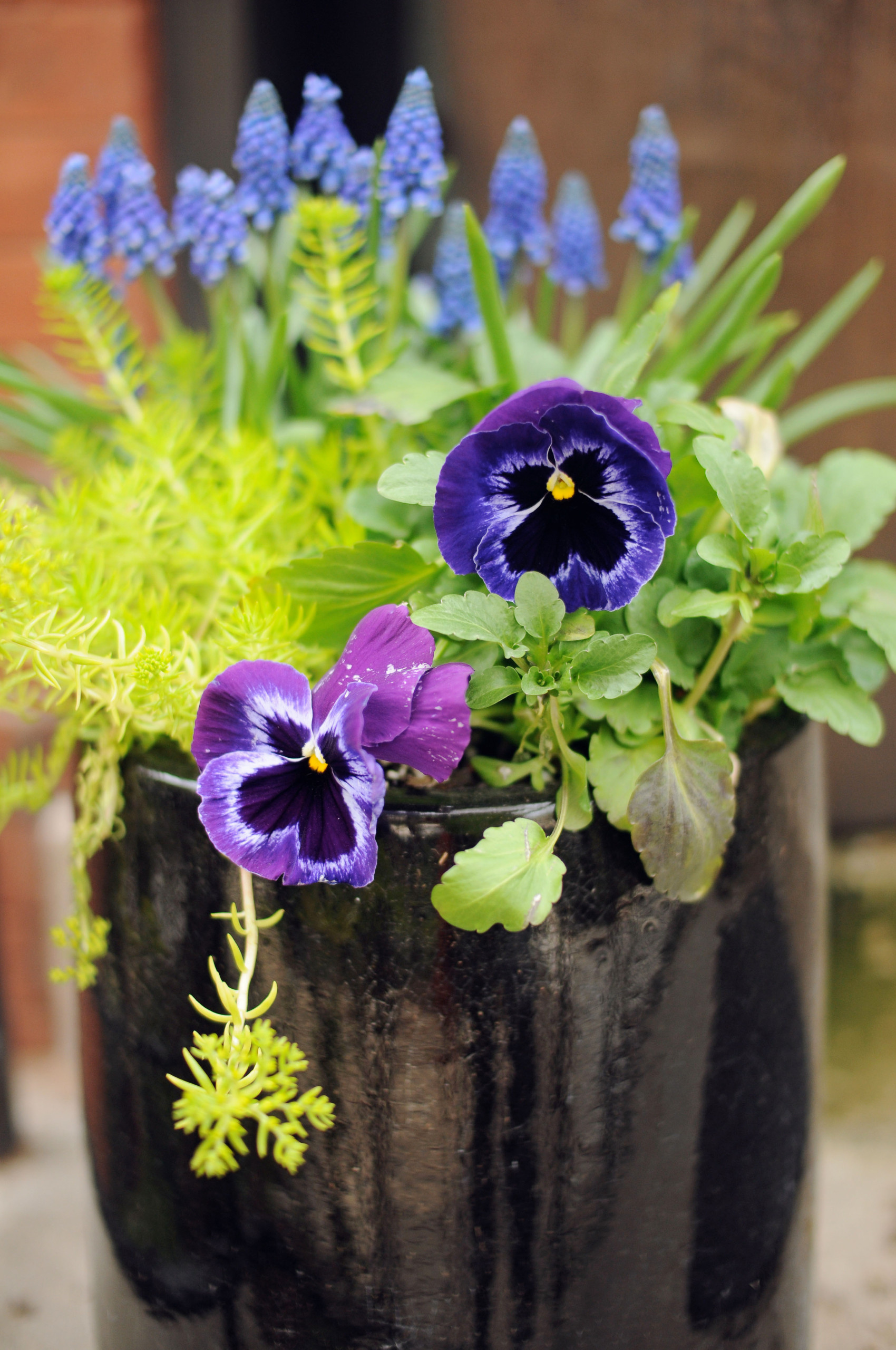 4. Miniature charm. Even the smallest spring containers can stand out when the rest of the garden or patio looks bleak. This pint-size trio of velvety purple pansies, grape hyacinths and ‘Angelina’ stonecrop (Sedum rupestre ‘Angelina’) pops in a shiny black ceramic container.