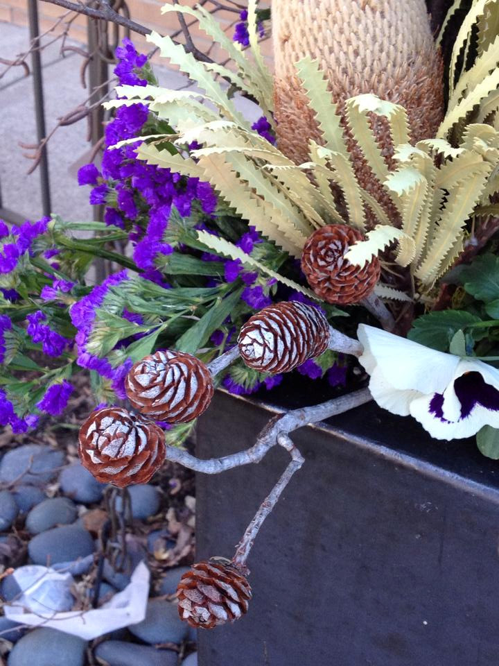 12. Preserved beauty. This transitional winter-to-spring arrangement is made up almost entirely of dried ingredients, including preserved purple sea lavender (Limonium sp.), proteas and branches of pine cones, plus a cluster of fresh pansies.