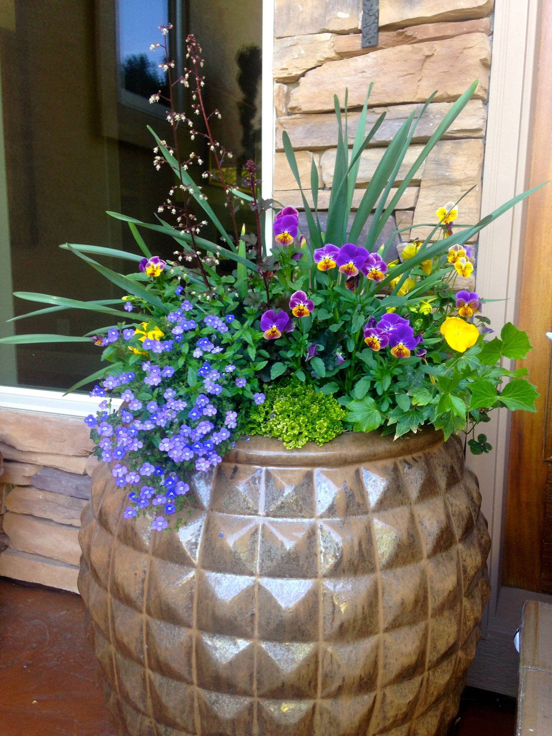 3. Pastel rainbow. Bicolored violas, tiny grape hyacinths, purple hyacinths, miniature yellow daffodils and pink tulips make a cheerful doorstep combination. To have all bulbs bloom at the same time in a container, pick up a combination bulb bag at planting time and layer the bulbs according to the package instructions.