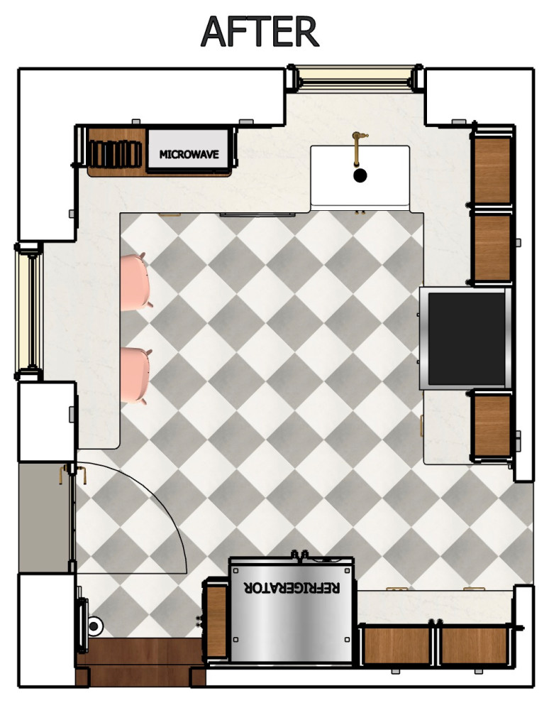 After: Removing the peninsula, relocating the refrigerator across the room (bottom middle), placing the sink under one of the kitchen’s two windows (top) and slightly shifting the new induction range (right) dramatically improved function and flow. The added counter with pink stools (left) provides extra seating in this family-friendly, classic-meets-modern space. “Now this kitchen is a little jewel box ready to make memories in this historic home,” Lewis says.