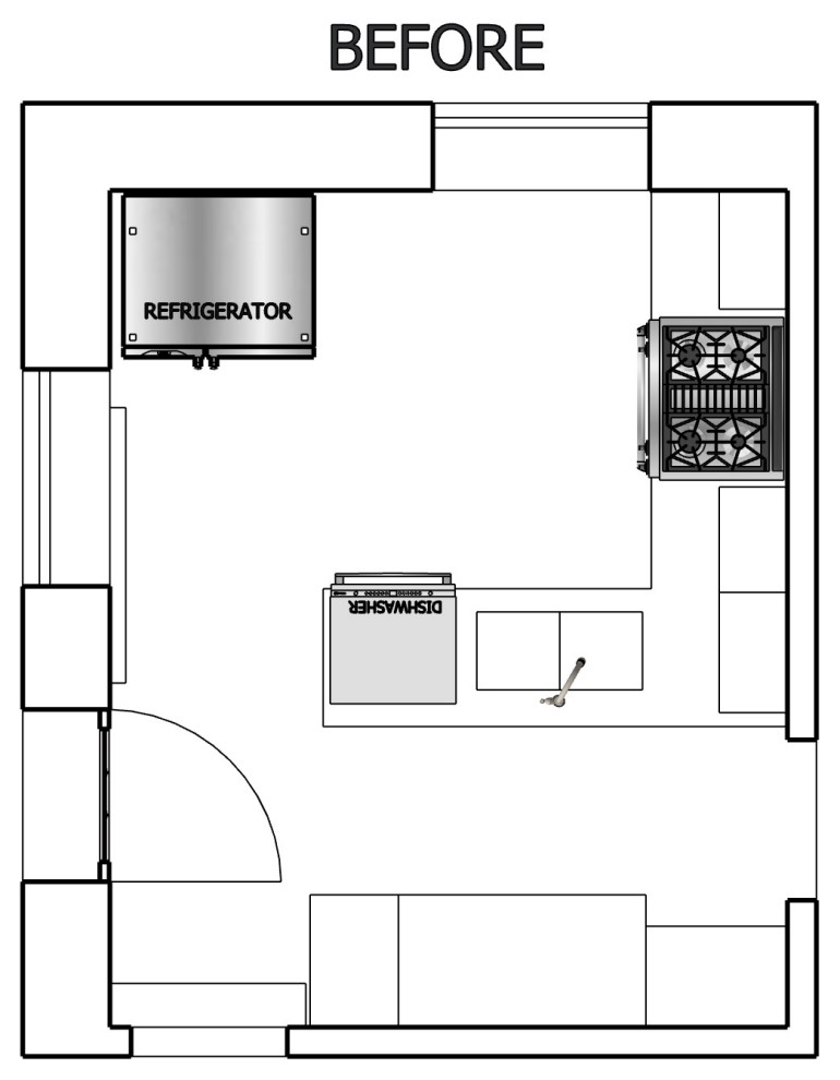 Before: The peninsula with sink and dishwasher (center) was the proverbial elephant in the room. Other challenges included the refrigerator’s location (top left), making better use of unused wall space (left) and improving workspace around the range (right).