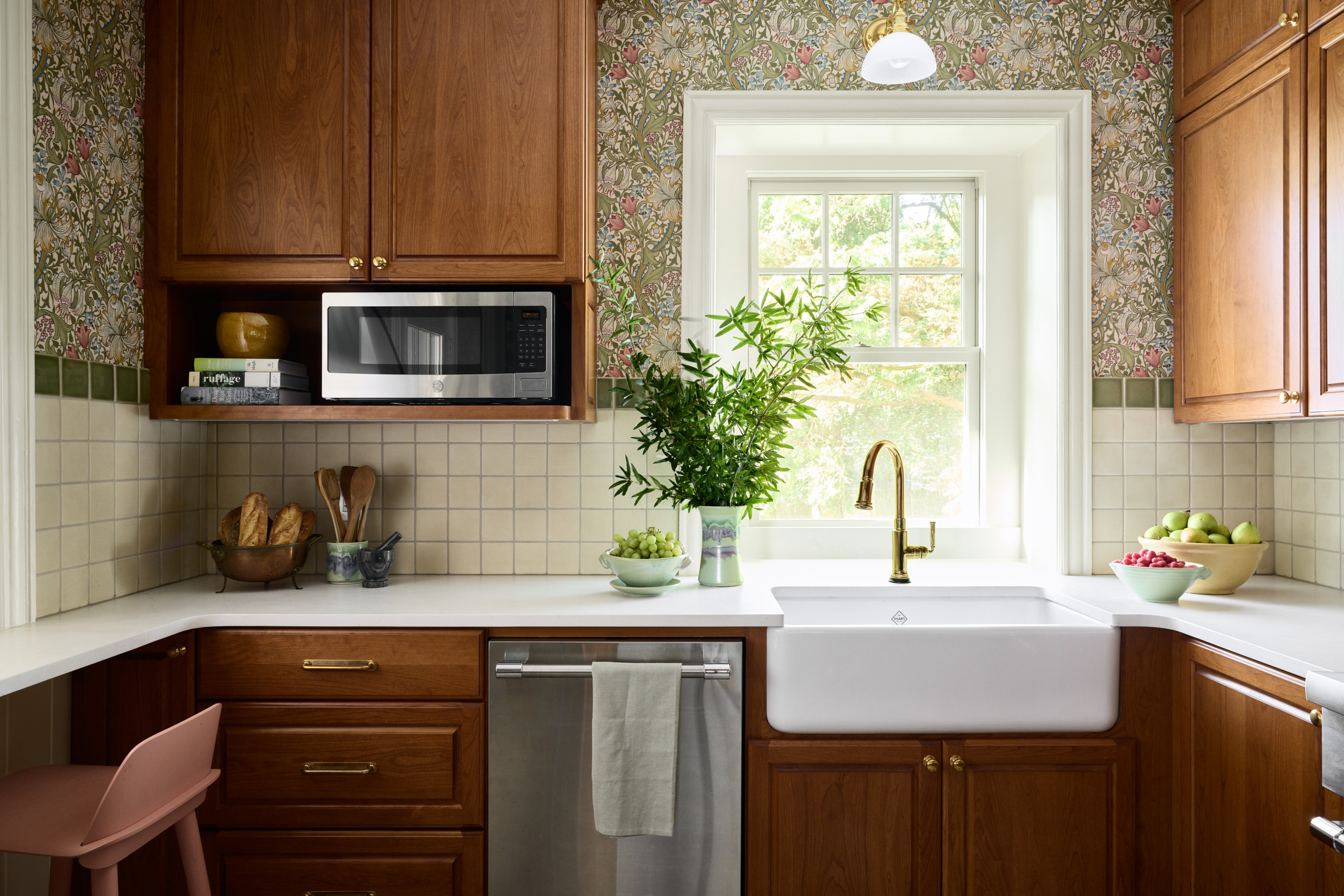 To give the room a sense of place, Lewis introduced lush floral wallpaper in pink and green tones. “To reflect the age of the home, we chose a wallpaper to give character from the Arts and Crafts era,” he says. “When working in historic homes in Mount Airy, we want to ensure kitchens feel functional, comfortable and fit the style of the home.”