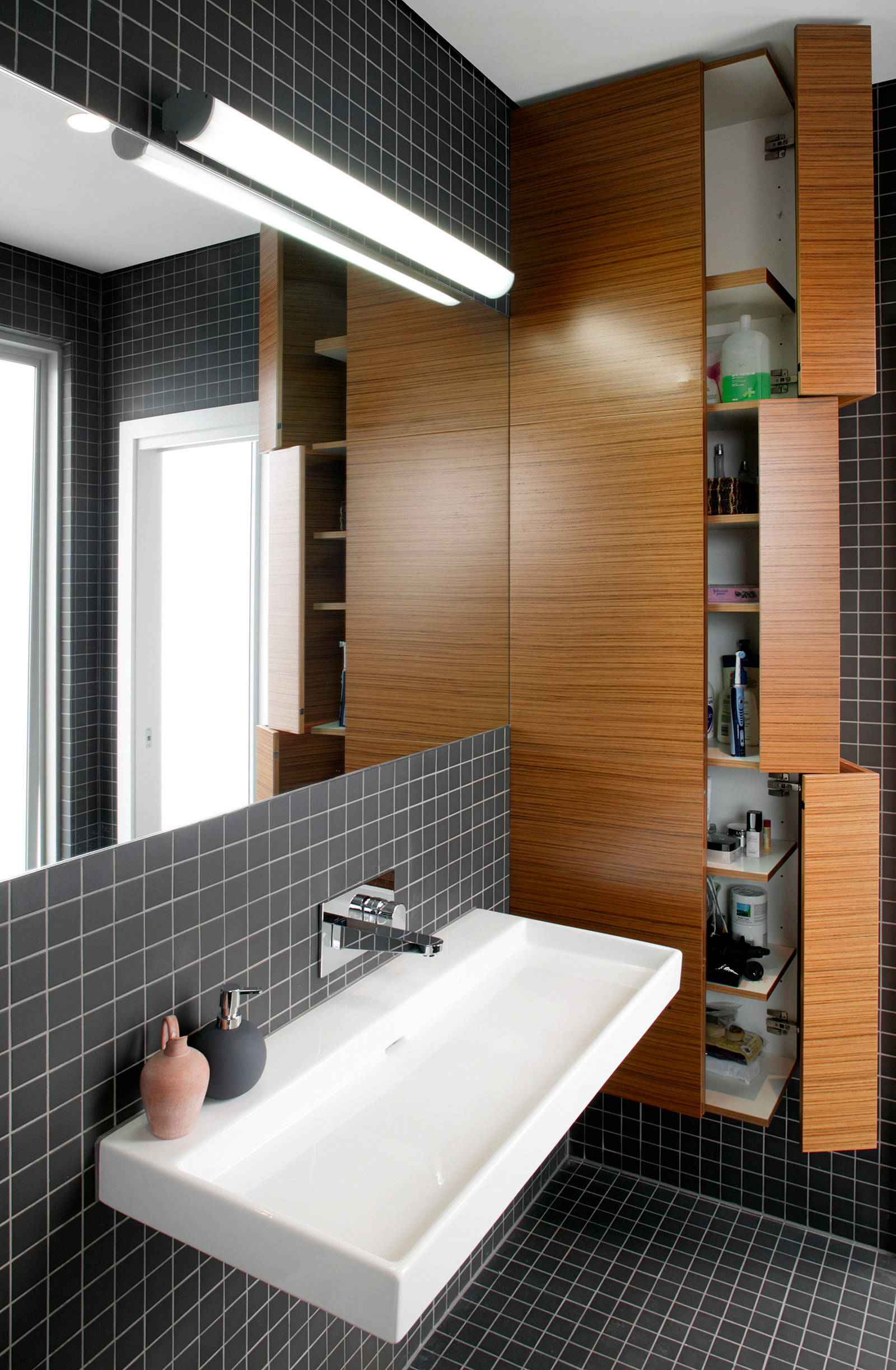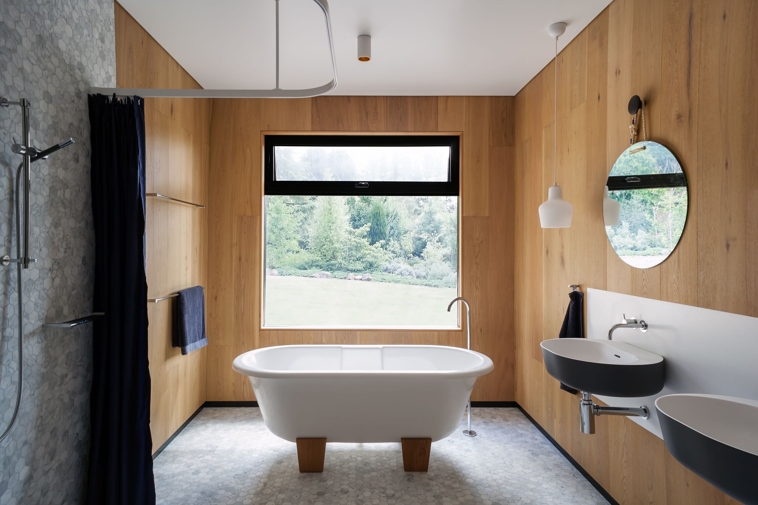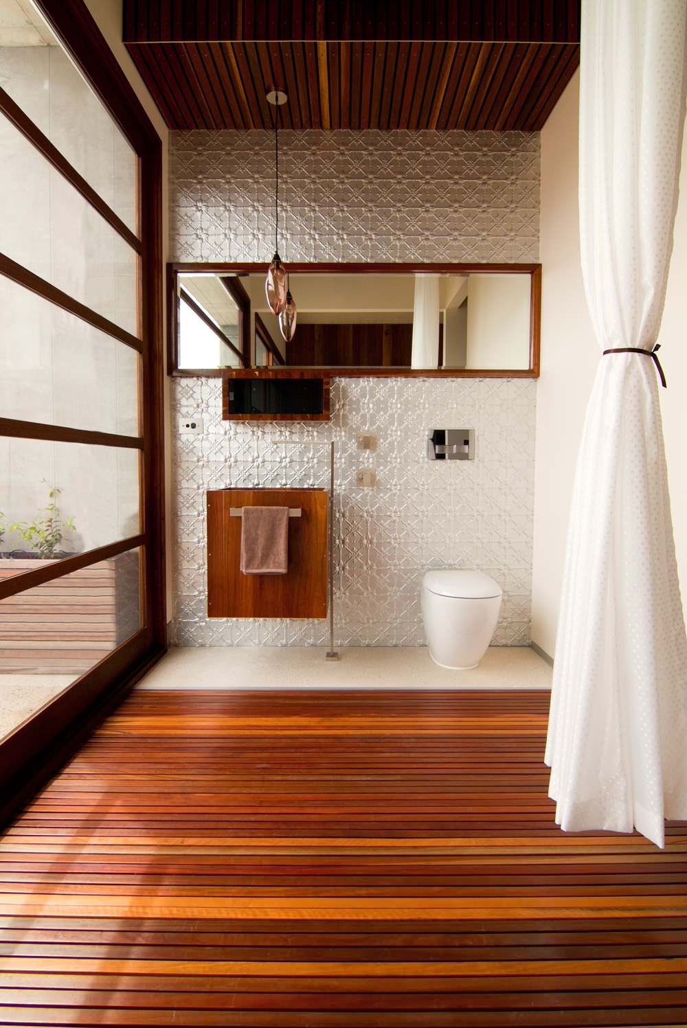 If you’re interested in working wood into your bathroom, take a cue from this striking example and consider using the material in unexpected ways, such as on the wall or as a sink.