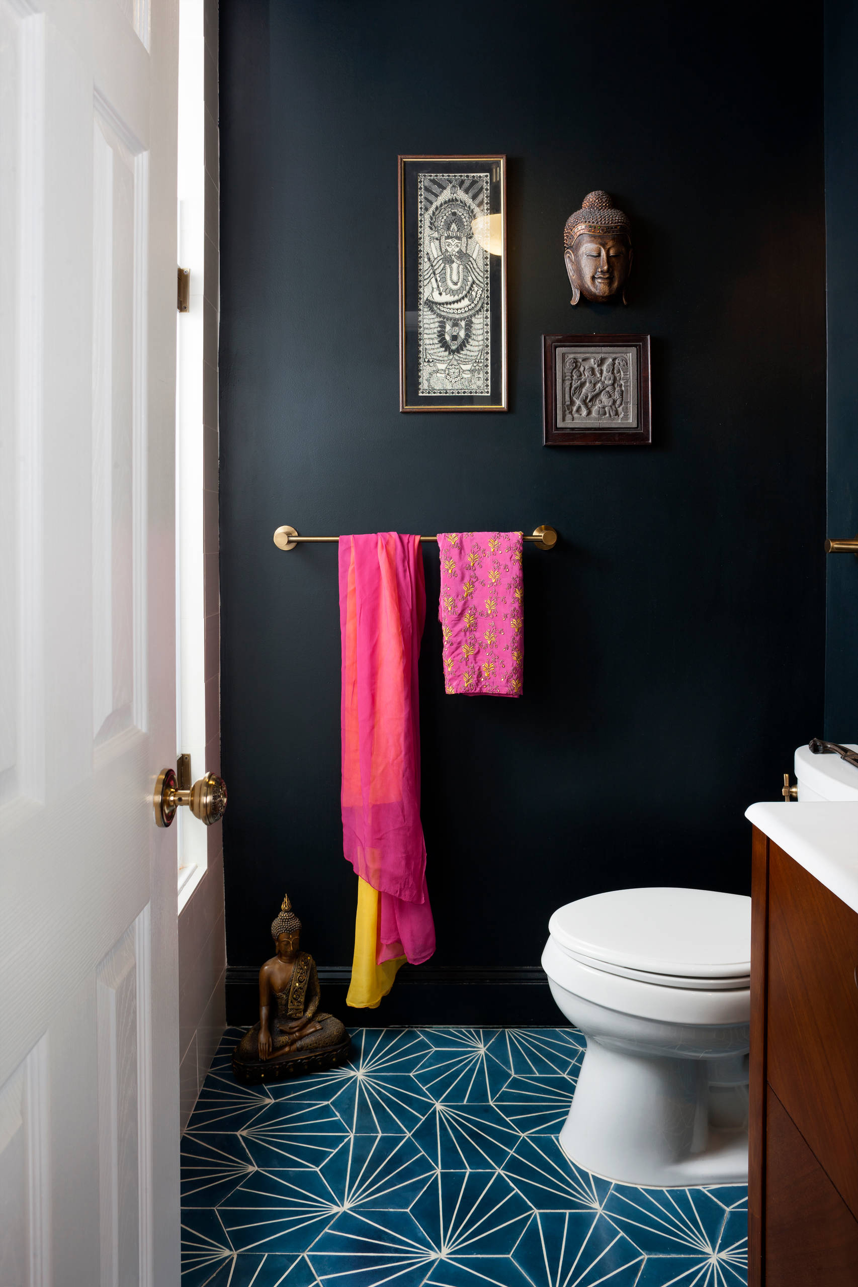 If you’re a lover of color and want a bathroom with extra oomph, an all-white or neutral palette probably isn’t going to cut it for you. Here, rainbow-colored rectangular tiles lift this herringbone feature wall to the next level and give the space some serious design cred.