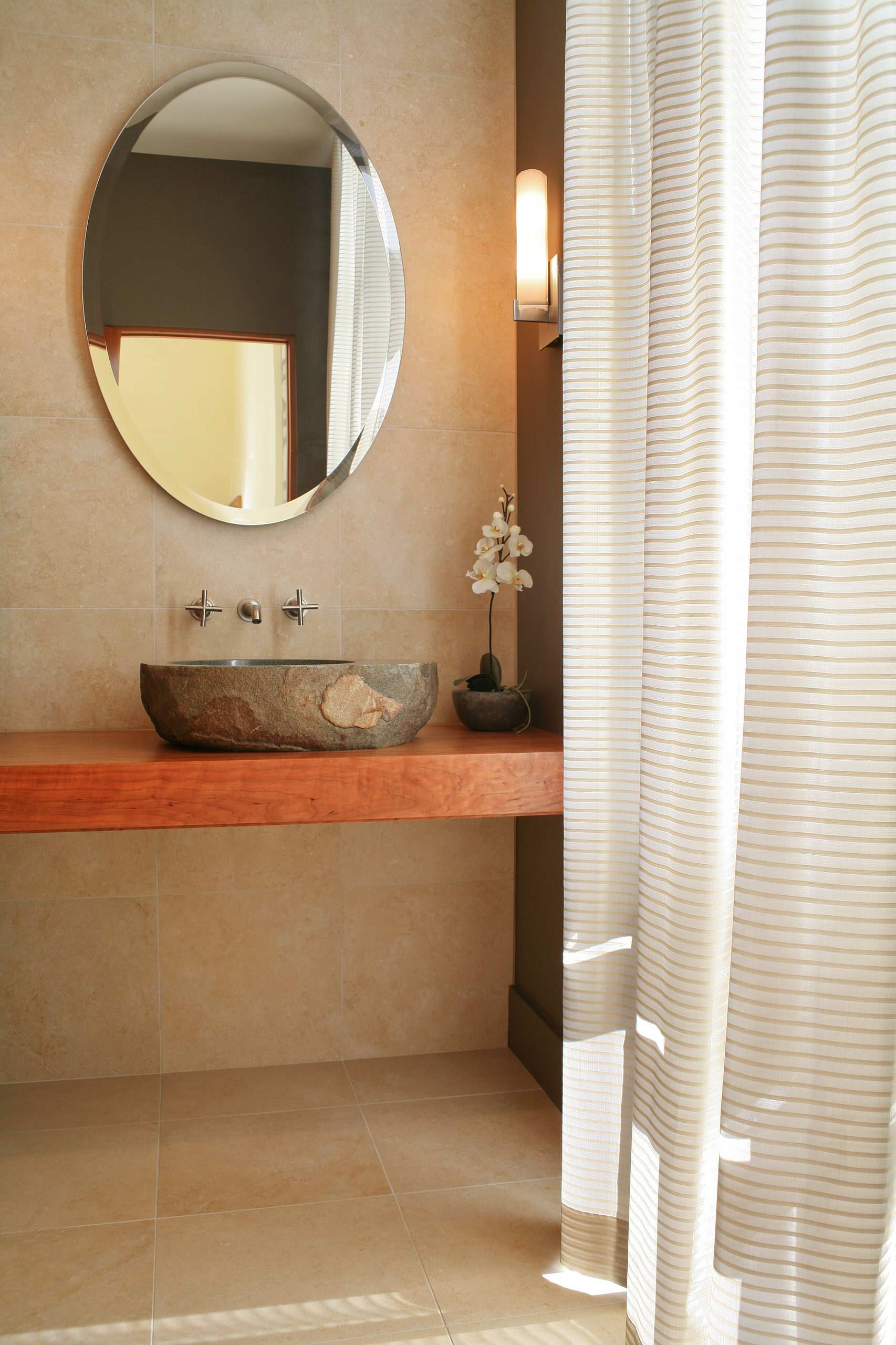 One way to bring the natural look to a bathroom, she says, is to opt for a kiln-fired ceramic or polished-stone sink instead of standard porcelain.