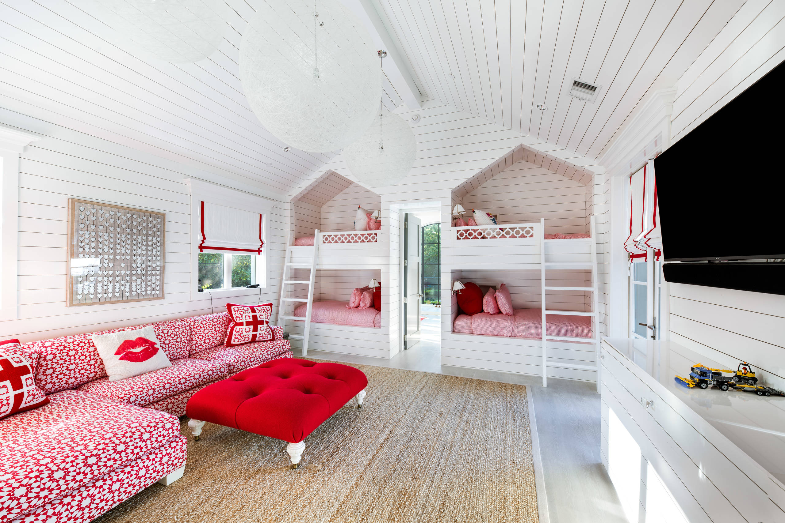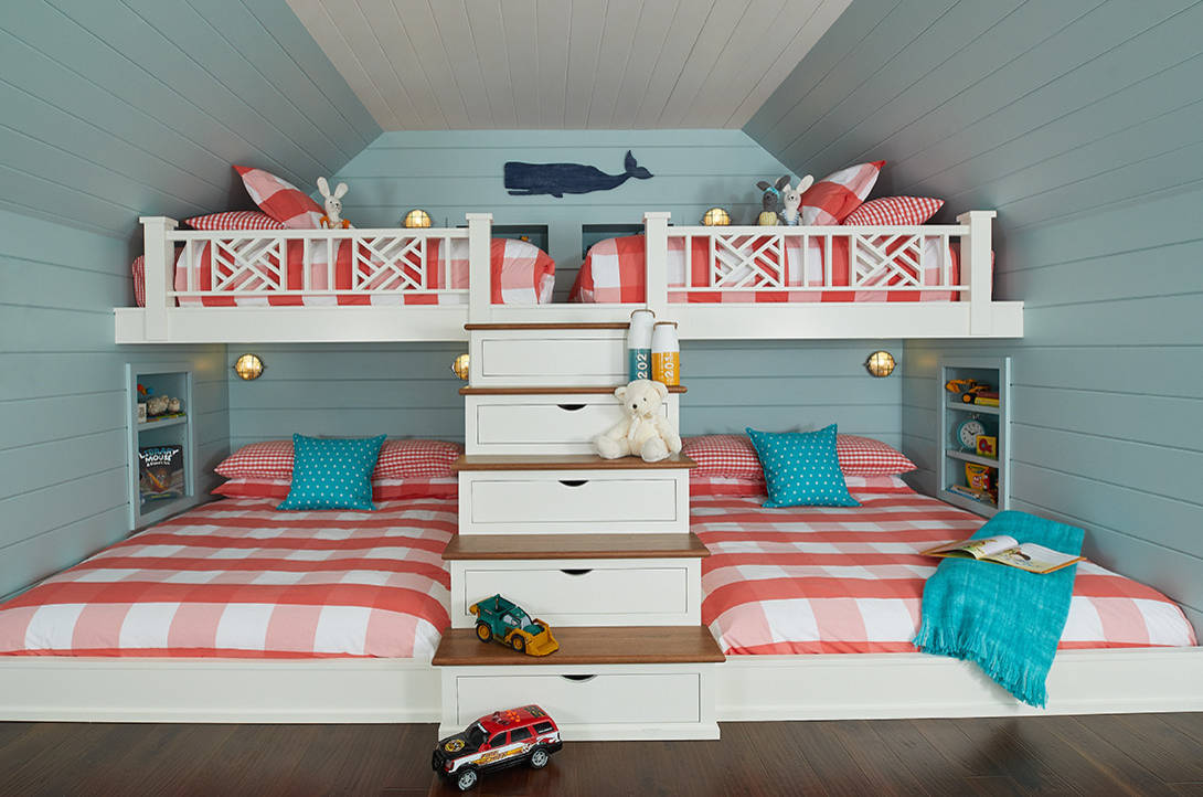 12. The design team at Bayberry Cottage turned an unfinished room above a garage into a children’s bunkroom for a beach house in Michigan. Cheerful red-and-white check bedding and shiplap walls painted in a vibrant light blue are among the stars of the space.