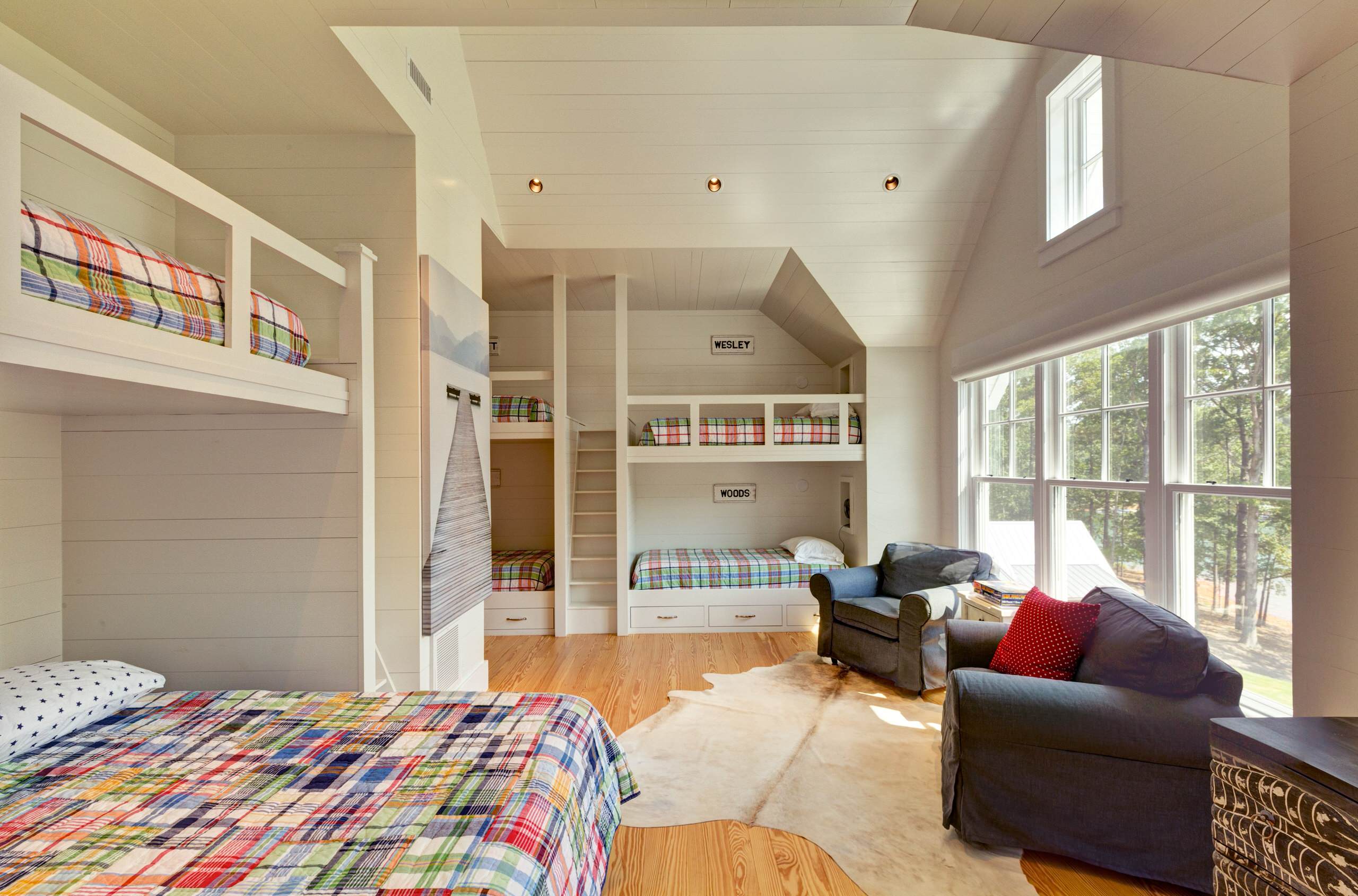 11. A bunkroom doesn’t require bunk beds. Three twin beds make up of this shiplap-clad attic bunkroom in a Texas Hill Country vacation house designed by Tim Cuppett Architects.