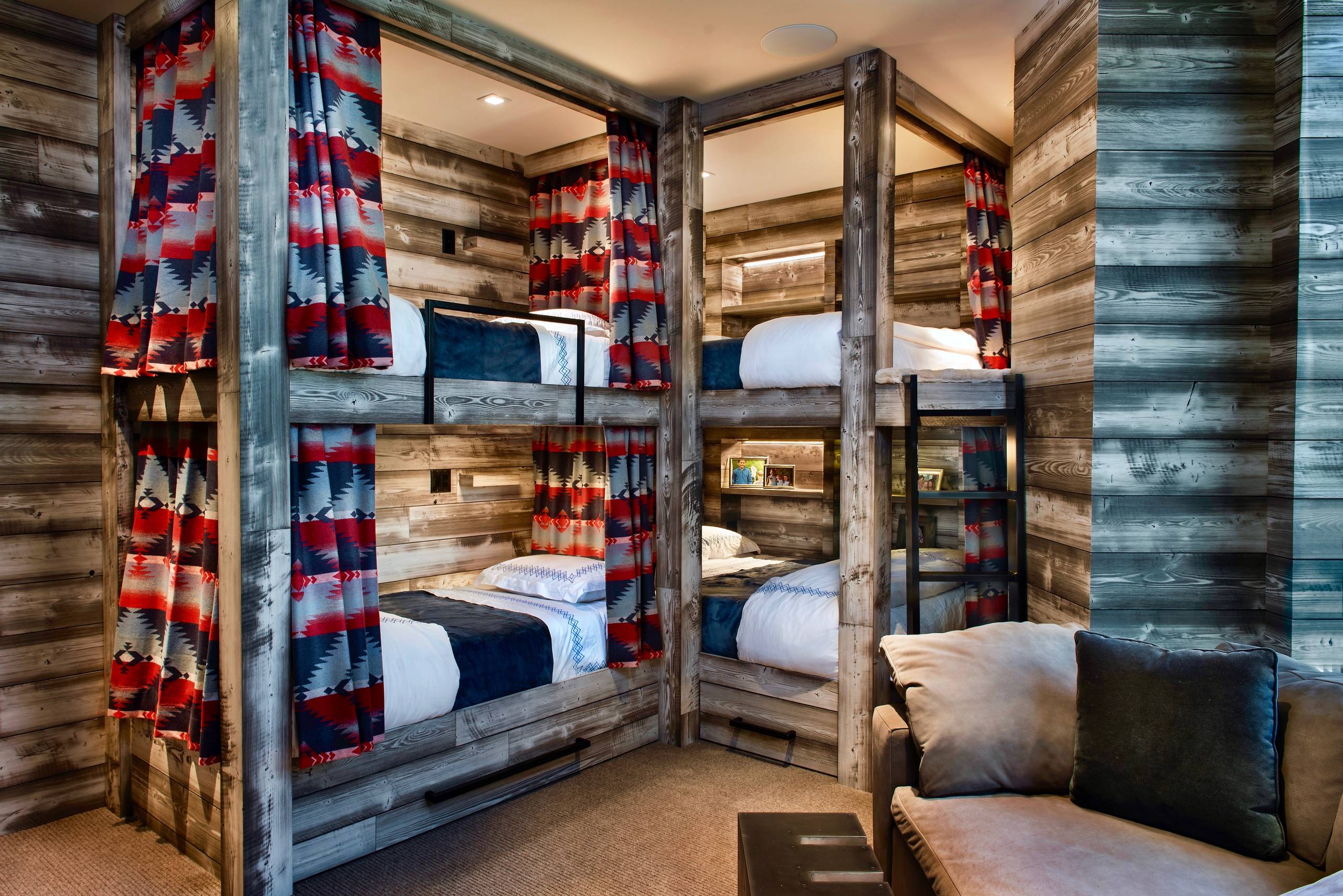 15. JMT Fine Living created this rustic yet luxurious bunkroom for a Utah ski chalet. Each custom bunk bed features a Ralph Lauren blanket that has been turned into a privacy curtain.