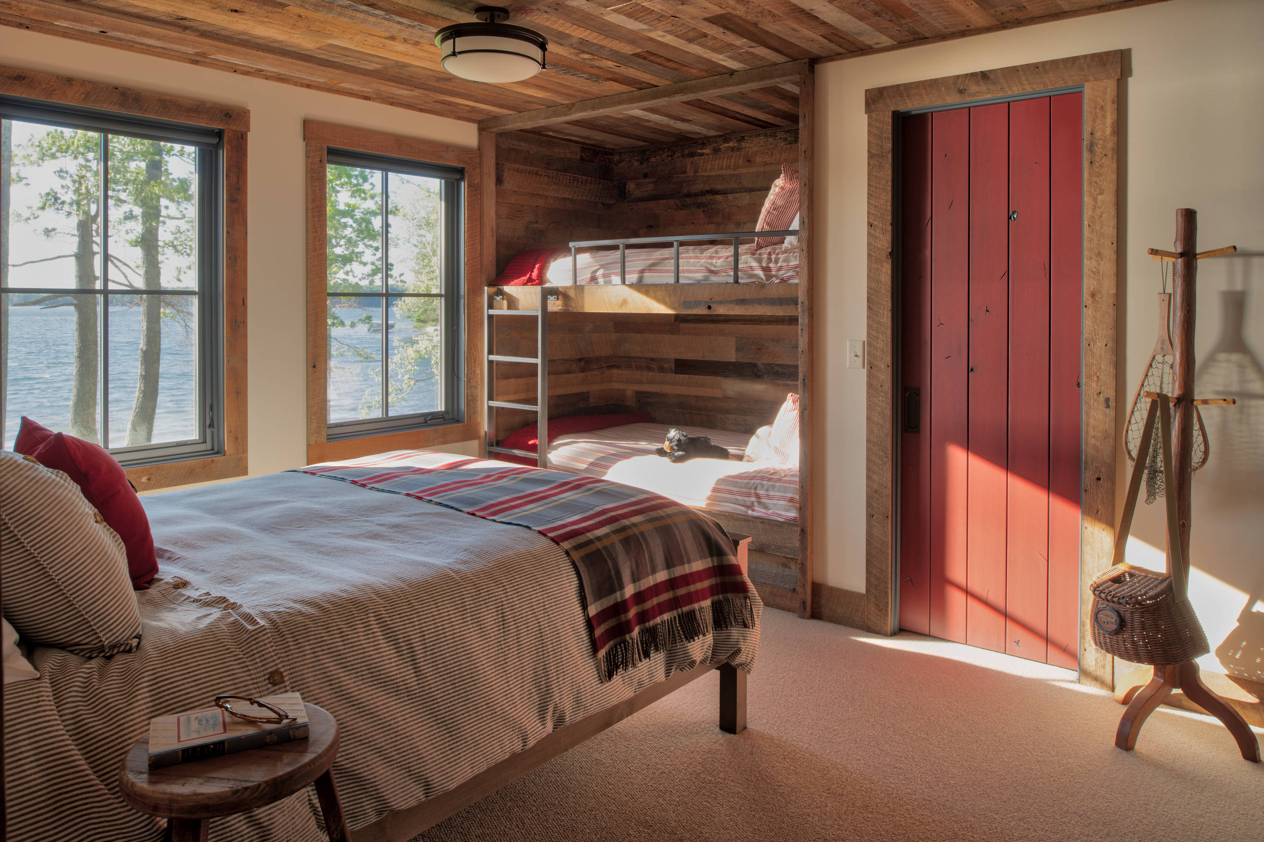 10. This rustic Wisconsin lake house includes a bunkroom featuring a ceiling and bunk bed made out of reclaimed wood. The space, with its lovely water views, was designed by Jean Rehkamp Larson of Rehkamp Larson Architects.