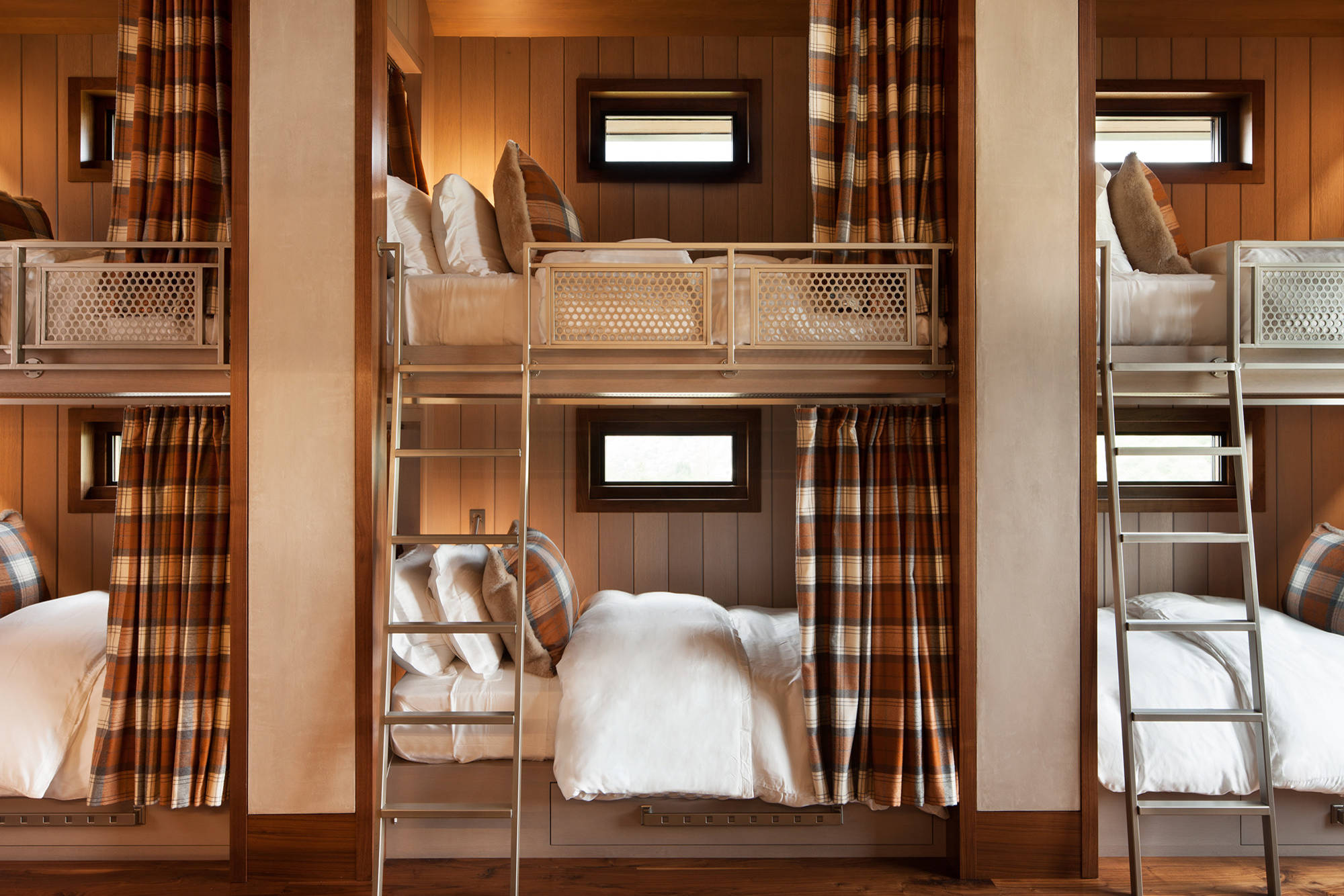 8. This mountain lodge in Aspen, Colorado, by Charles Cunniffe Architects includes an elegant bunkroom with six bunks set up like sleeper cars on a train. Each bunk has its own plaid curtain for privacy.