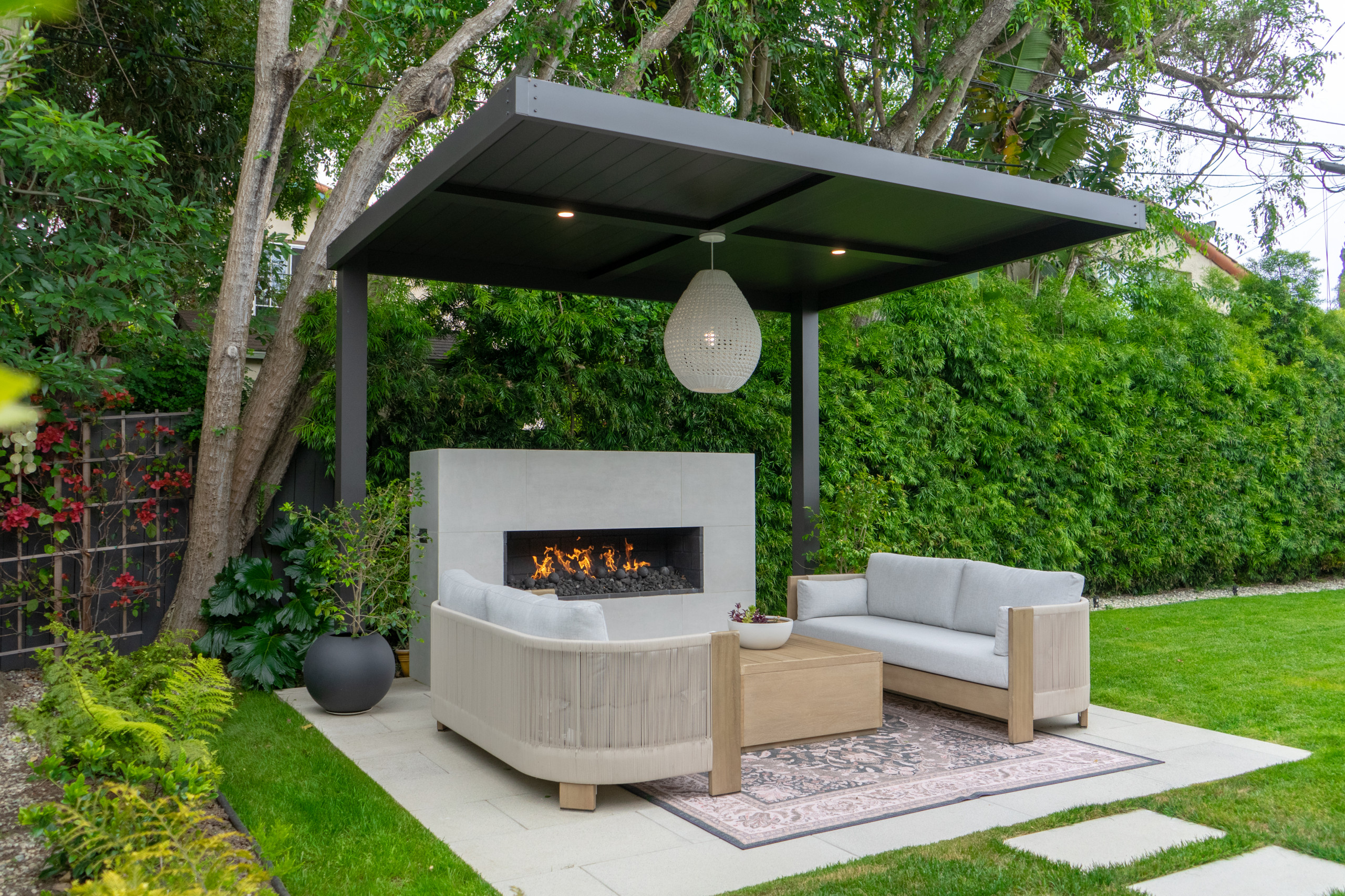 This compact lounge area is an elegant, comfortable haven in a Los Angeles backyard. Along with the seating and fireplace, the key to its success is a cantilevered roof by MG Construction & Decks that shelters visitors from rain and sun. The roof creates the opportunity for stylish lighting, and a white woven pendant, flanked by two downlights to boost illumination, finishes the space.