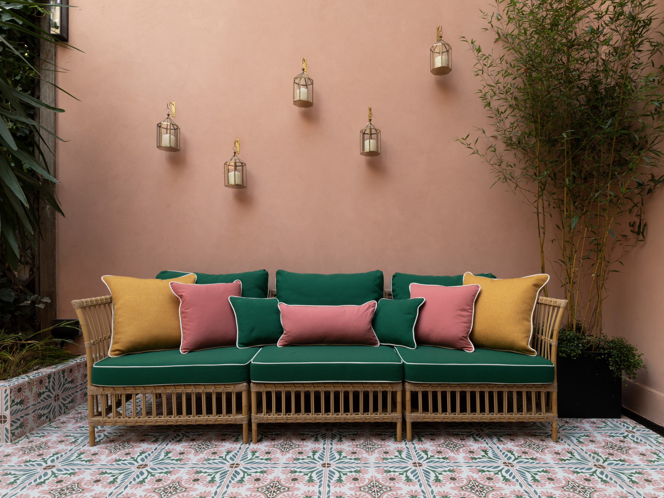 This charming sofa in a London yard feels like the perfect spot for catching up with friends, with candle lanterns dotting the wall behind.