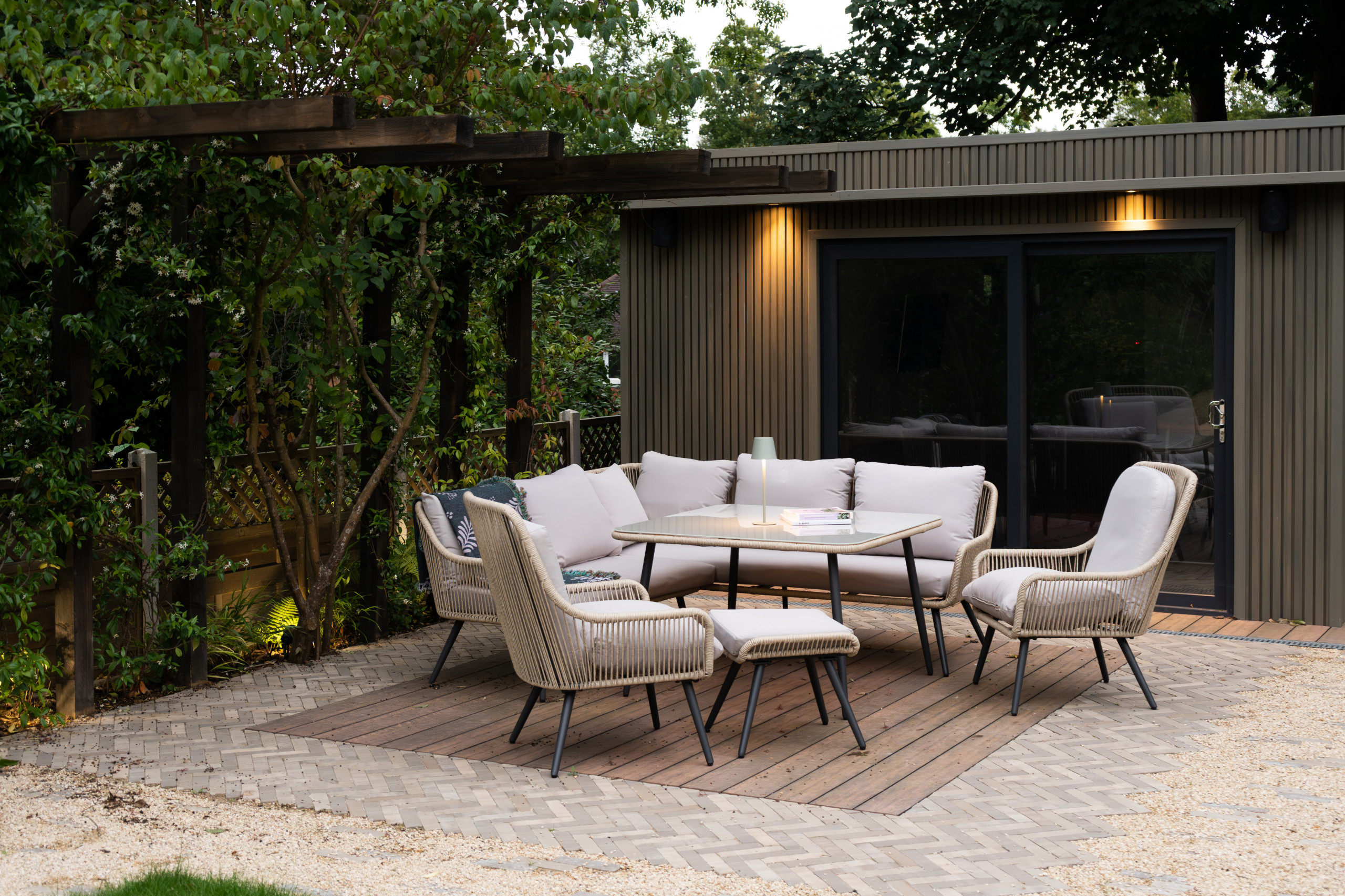 These woven lanterns in an outdoor entertaining space by Hartley and Rose in Devon, England, fit perfectly with the rustic wood structure and woven chairs. They contain candles, but you could easily choose solar- or battery-powered versions.