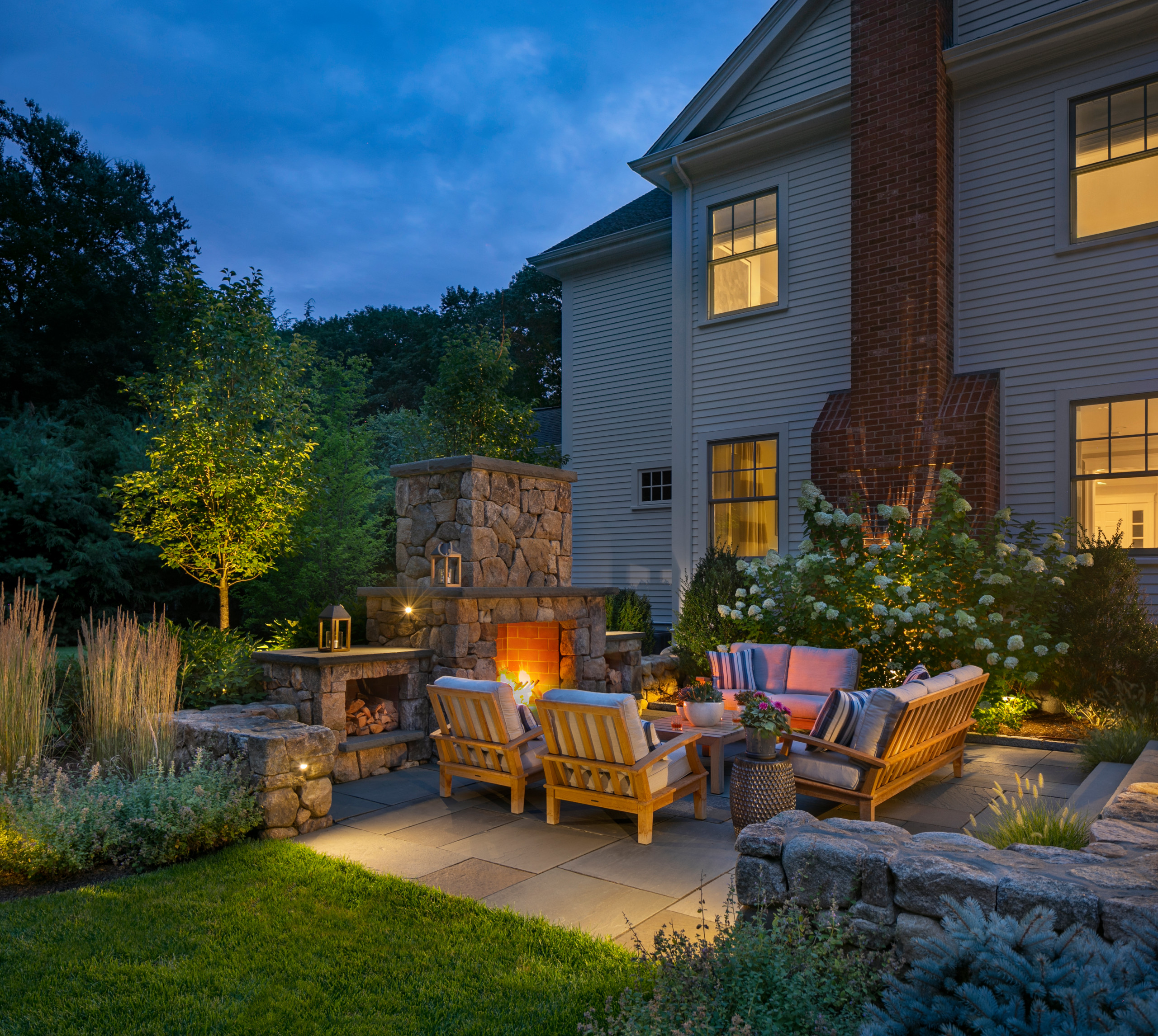 The chunky stone walls surrounding this snug patio in Boston by Sudbury Design Group are studded with spotlights, angled downward to avoid glare. The spotlights also highlight the pleasing texture of the stone.
