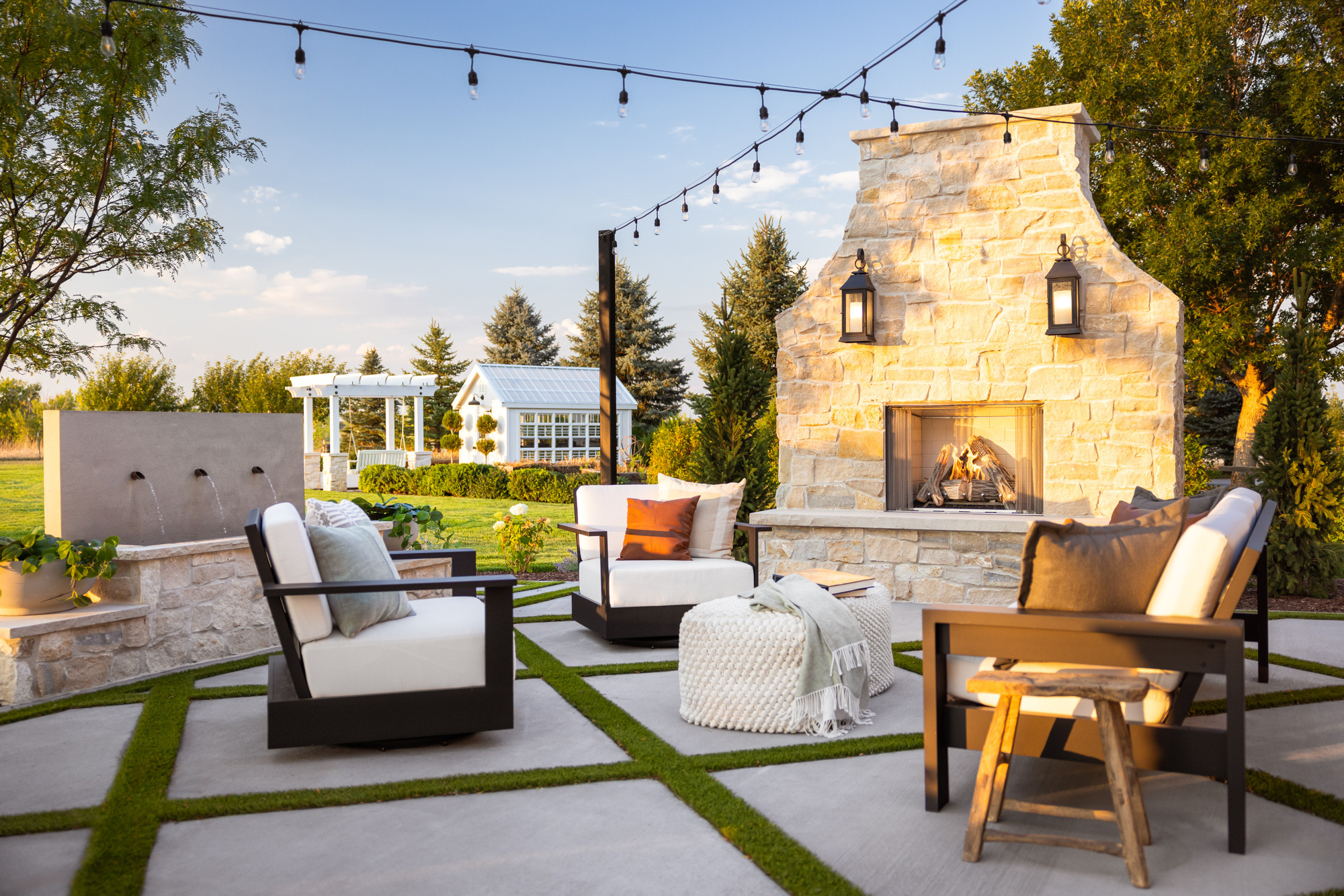 No walls, fences or trees nearby? No problem. Rig up string lights between posts, as in this design by Lindgren Landscape in Denver. Here, the overhead lights are teamed with lanterns and a fireplace to spread the glow, but you also could wind string lights around the posts to boost the ambiance lower down.