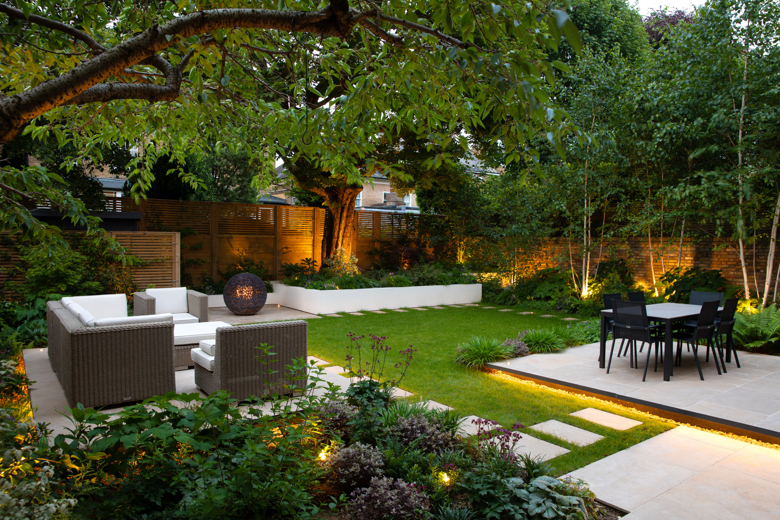 Landscape designer Peter Reader created distinct dining and seating areas amid lush plantings in this London yard. LED strips embedded around the paving serve both to zone and illuminate the patios, while spotlights within the foliage create a magical glow after dark.