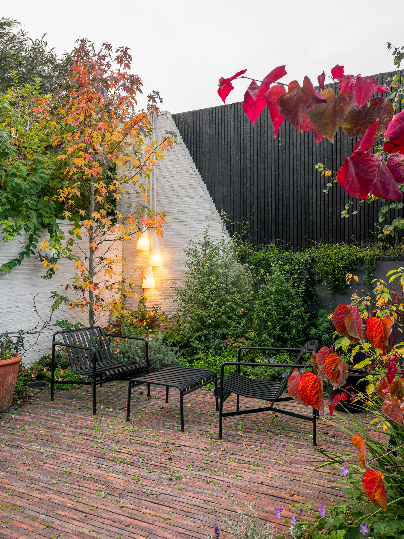 A trio of pendants cascades in a cluster from the top of the back wall, with the white shades set against white brick for a subtle look. Once the sun goes down, the pendants gently illuminate the Japanese maple and relaxed seating area.