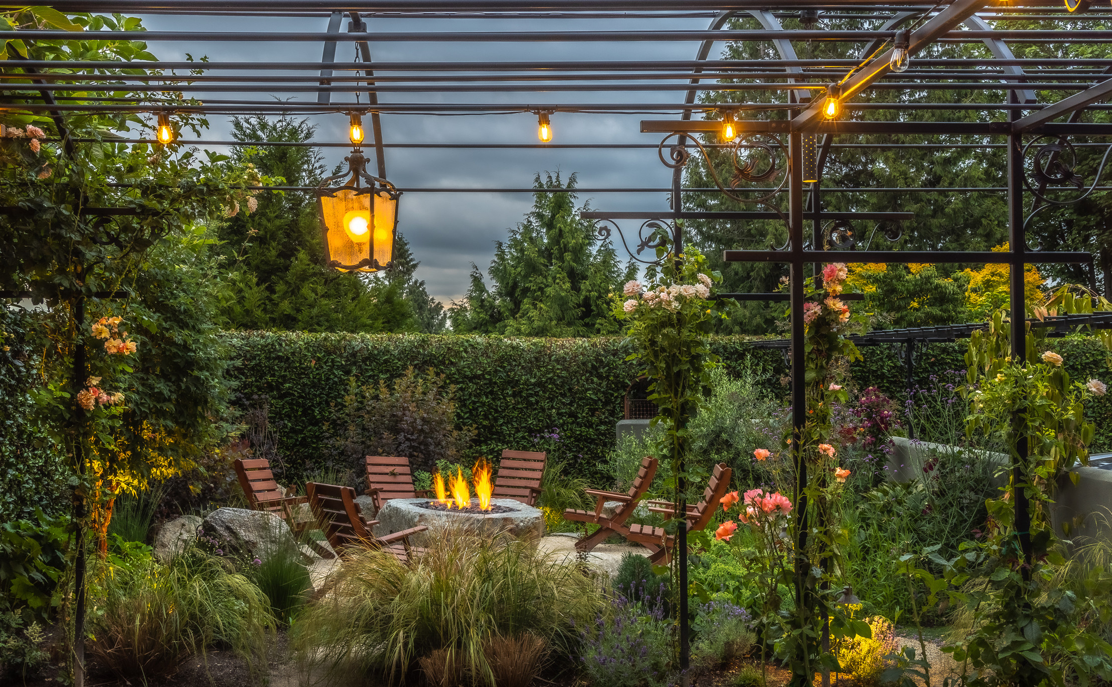 Lanterns (including one just out of frame) and string lights hang on this arched metal structure in a project by Avalon Northwest Landscape in Seattle. They add illumination up high to complement the low-key glow amid the foliage and flickering flames of the fire pit for relaxed evening gatherings.