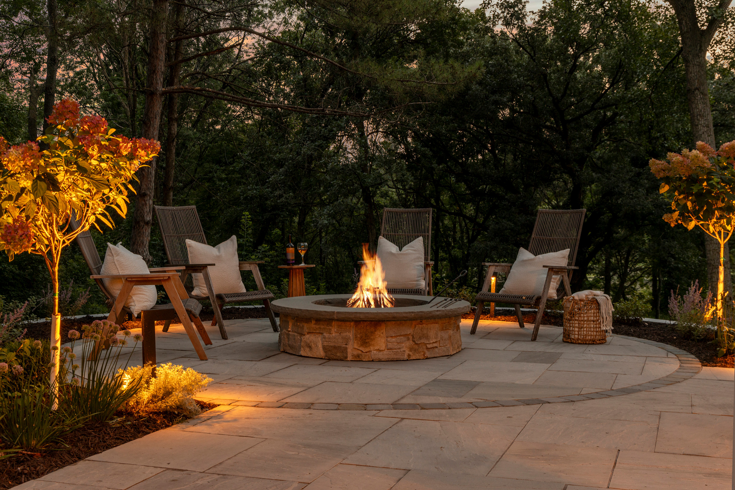 If you prefer the idea of chatting under the stars in low light, take inspiration from this Minneapolis patio by Mom’s Design Build. Simple lighting peeks out from the surrounding foliage to provide, along with the central fire pit, just enough illumination for relaxing around the flames and catching up with friends.
