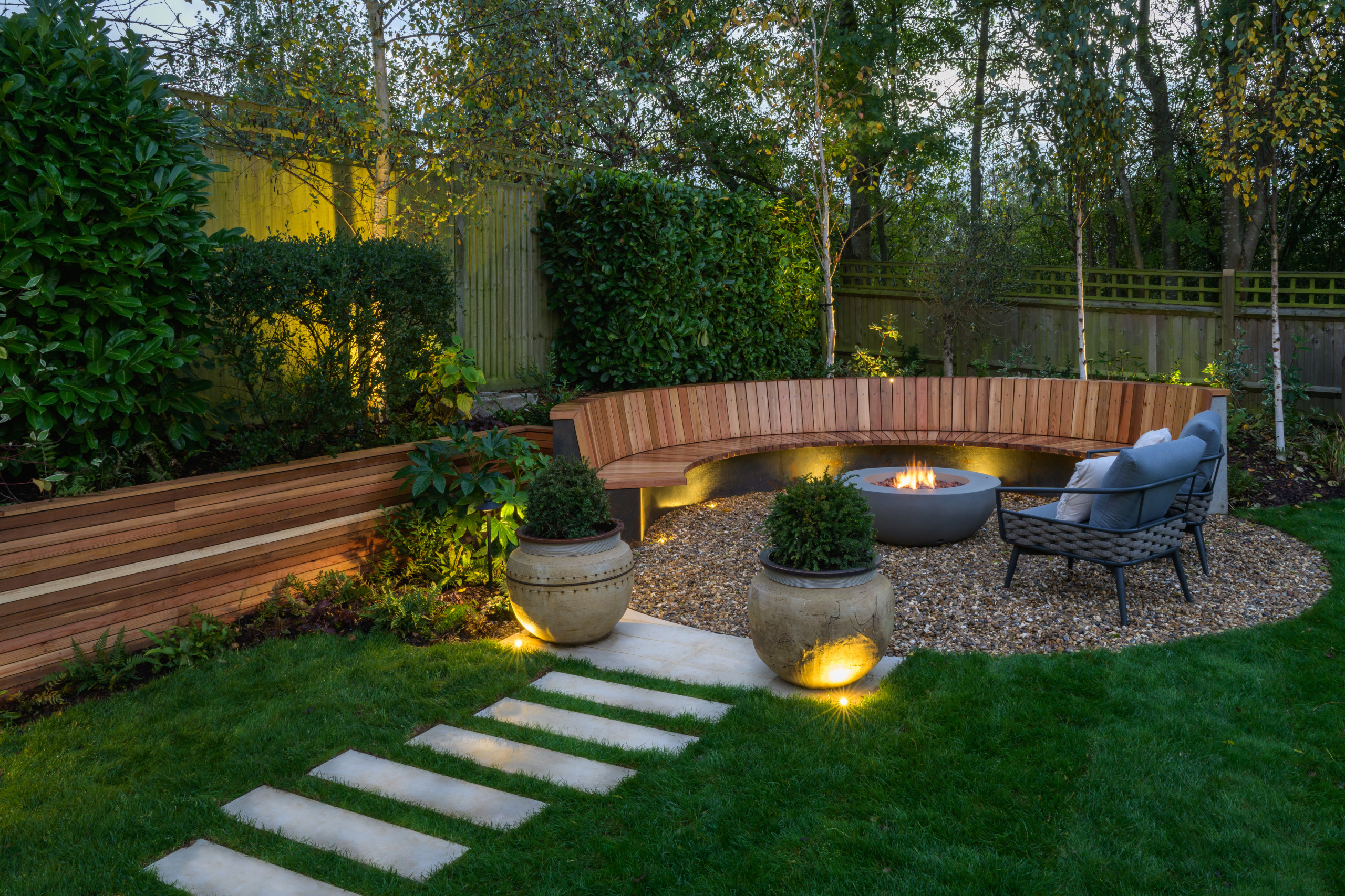 A wooden bench seat curves around a circular fire pit on a gravel patio for an organic feel in this Hertfordshire, England, yard. Designer Kathryn Cox illuminated the area subtly with uplights under the bench and at the backs of the plant containers to add a warm glow without creating a glare for anyone seated around the fire.