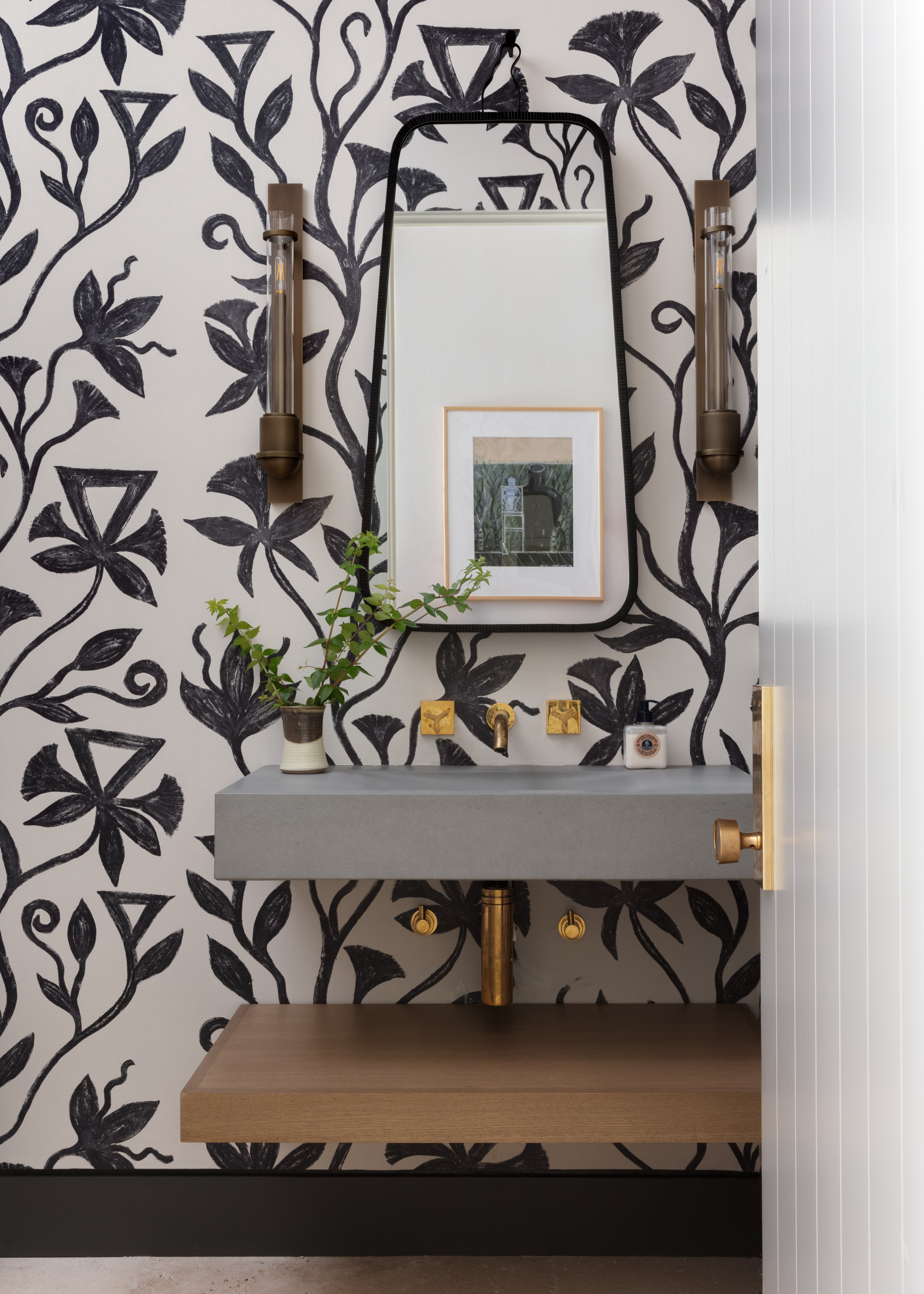 In a transitional-style home in Keller, Texas, by Thayne Hillrichs of Distinctive Dwellings, this powder room has a wallcovering from L’Aviva Home that looks like flowering vines hand-drawn in charcoal. Emily Gilbert Designs paired it with gold-tone hardware and a concrete-look wall-hung sink with a wooden shelf below.
