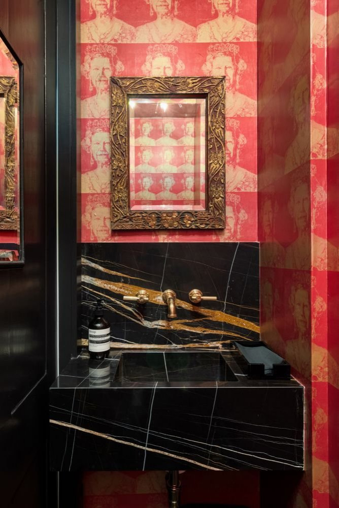 This small powder room in a 19th-century townhouse in New York City’s West Village was uploaded by Dutchman Contracting. It has a regal look thanks to its golden mirror and wall-mounted faucet and gold veins in the black stone sink and backsplash. But the jewel in its crown is the red wallpaper, designed by painter Hunt Slonem for Groundworks, which is gilded with images of the late Queen Elizabeth II.