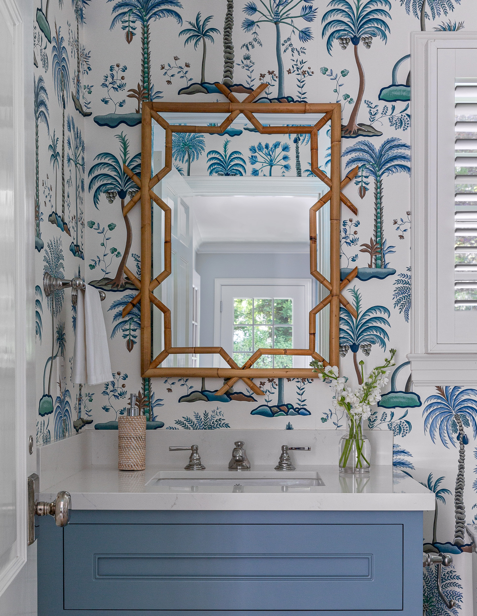 Christine Sheldon Design took this Hillsborough, California, powder room on a little tropical vacation (by way of the Far East) with a bamboo mirror, a sky-blue-and-white palette and a chinoiserie wallpaper covered in palm trees from Clarence House.