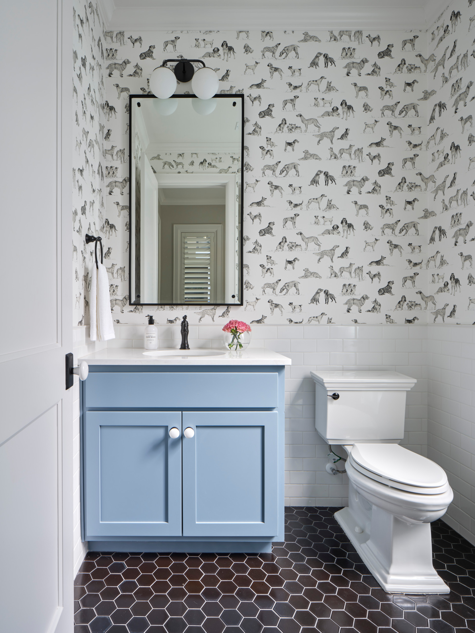 Zoom in on the black-and-white Thibaut wallcovering in this Austin, Texas, powder room and you’ll see dogs of all breeds and sizes lounging and milling about. Click the photo to see the rest of the project, uploaded by Olson Defendorf Custom Homes, and you’ll find the real-life dog of the house resting in a built-in pet bed just outside the powder room door.
