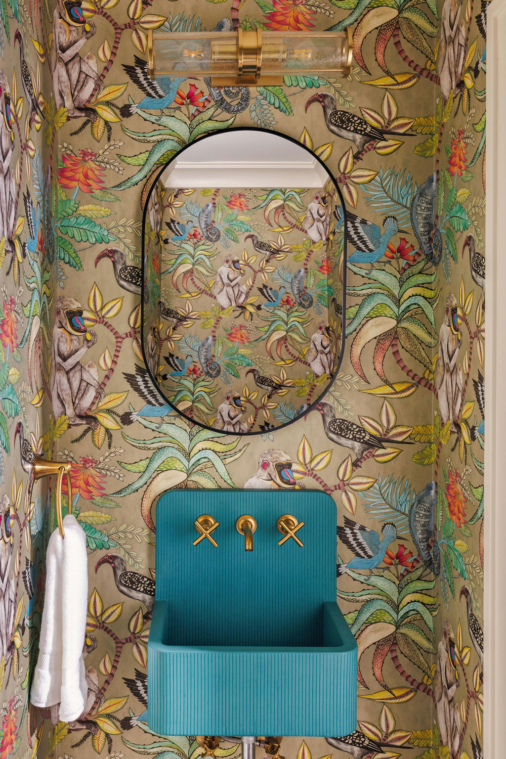 A bright turquoise wall-hung sink pops against the African wildlife-inspired Cole & Son wallpaper in this Minnesota powder room by Allison Landers and Joy Architecture + Interior Design. You can almost hear the calls of the mandrills, hornbills and hoopoes that wrap the room’s walls.